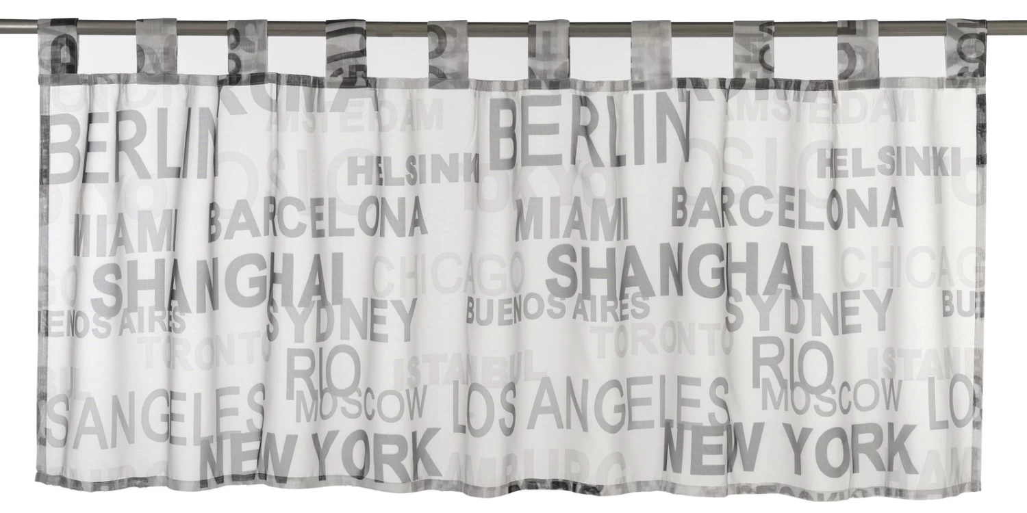 Mit der transparenten Scheibengardine 198800 von Elbersdrucke aus der Serie „City“ werten Sie Ihren Fensterbereich in der Küche stilvoll auf. Der Vorhang hat ein Stoffmaß von ca. 48 x 140 cm (LxB) und ist zu 100% aus Polyester gefertigt. Das Produkt kann bei 30°C im Schonwaschgang schnell und einfach gereinigt werden. Die Bistrogardine begeistert mit trendigen, aufgedruckten Städtenamen. Zusätzlich bietet Ihnen dieses pflegeleichte Panneau, mit praktischer Schlaufen-Aufhängung, einen leichten Sichtschutz: Der untere Teil des Fensters wird verdeckt und hält neugierige Blicke fern, Sie können aber trotzdem den Ausblick genießen.