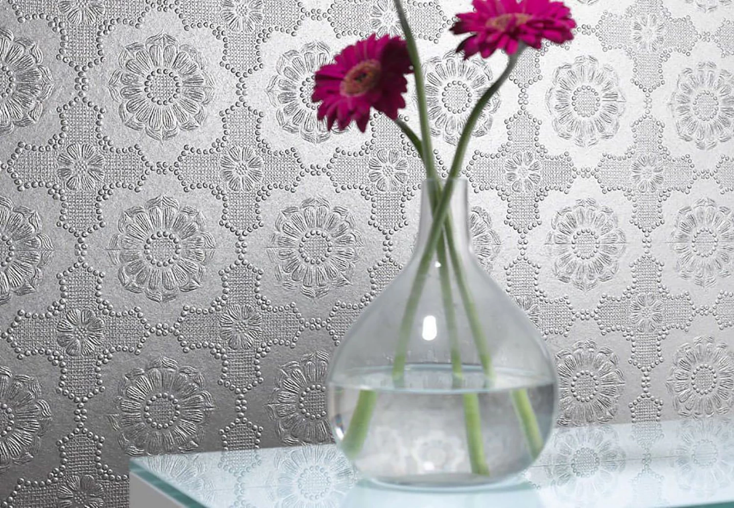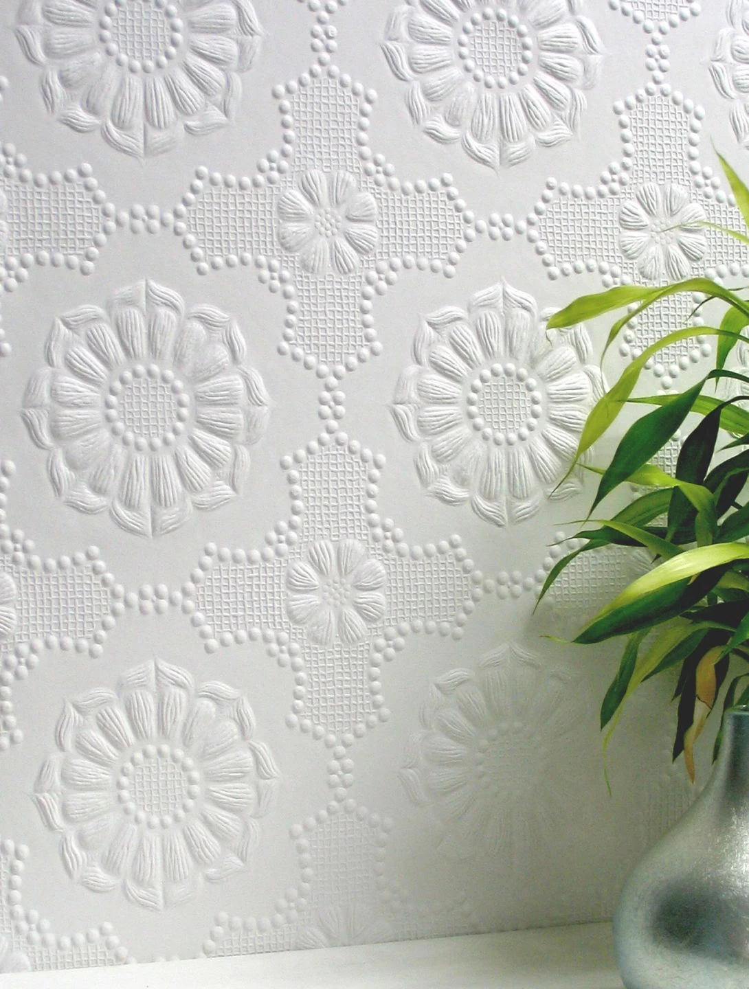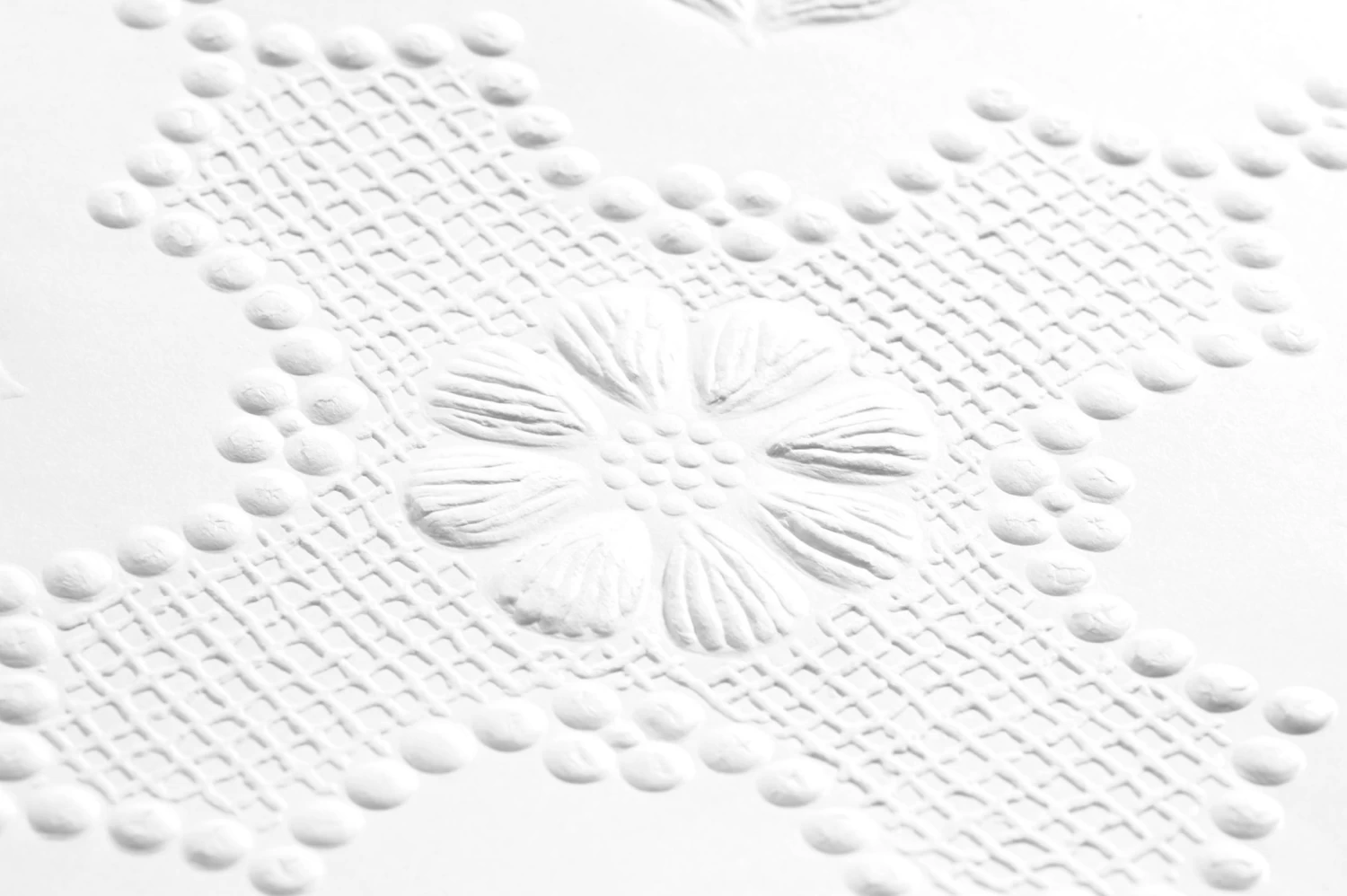 Großflächige stilisierte Blüten dominieren das Erscheinungsbild dieser Relieftapete. Die erhabenen Elemente des Musters ergeben im Zusammenspiel von Licht und Schatten reizvolle Kontraste und eine lebendige Plastizität. In Weiß strahlt die Tapete Klarheit und Eleganz aus, doch Sie können sie auch in einer Farbe Ihrer Wahl überstreichen und erzielen damit ganz unterschiedliche Wirkungen für Ihren Raum.