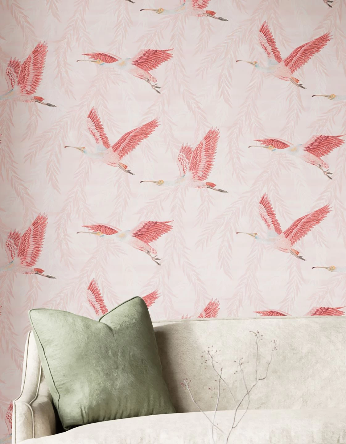 Ein rosaroter Traum von der Wärme des Südens ist es, den die großen Vögel mit in ihre vier Wände bringen! Auf ihren großen Schwingen schweben sie vor einem Hintergrund aus ganz zart rosafarbenen Zweigen und Blättern. Ergänzt mit weißen Möbeln oder Deko-Elementen in einem der verwendeten Rosatöne, ist die detailgetreu gezeichnete, außergewöhnliche Tiermotiv-Tapete ein stimmungsvoller Wandschmuck für Ihr Zuhause.