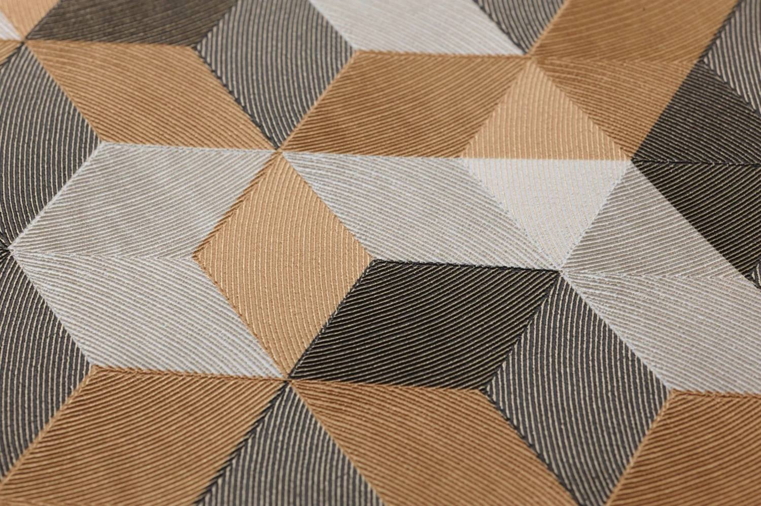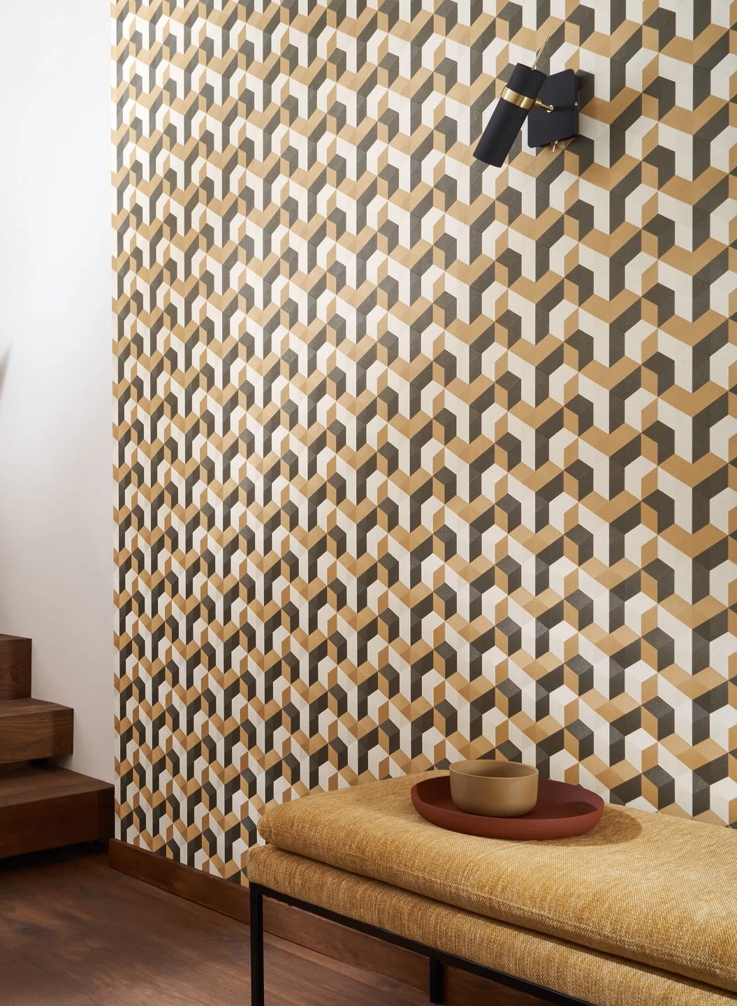 Faszinierende Geometrie verwandelt die Fläche Ihrer Wand in ein dreidimensionales Gebilde aus Würfeln, Kanten und Stufen. Fast wie in einer Zeichnung von M. C. Escher bewirkt die Anordnung der geometrischen Elemente gemeinsam mit der ausgeklügelten Verteilung der Farben die Illusion von räumlicher Tiefe. In die Vinyloberfläche eingearbeitet ist eine feine Struktur aus Schraffuren, die den Effekt noch verstärkt.