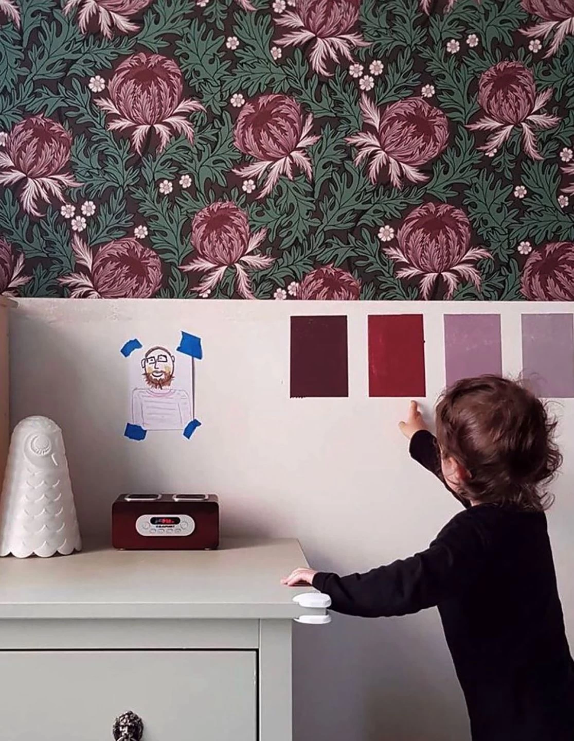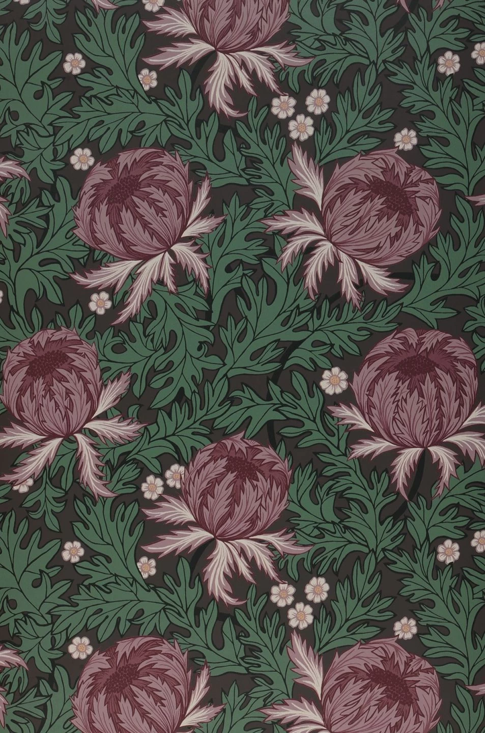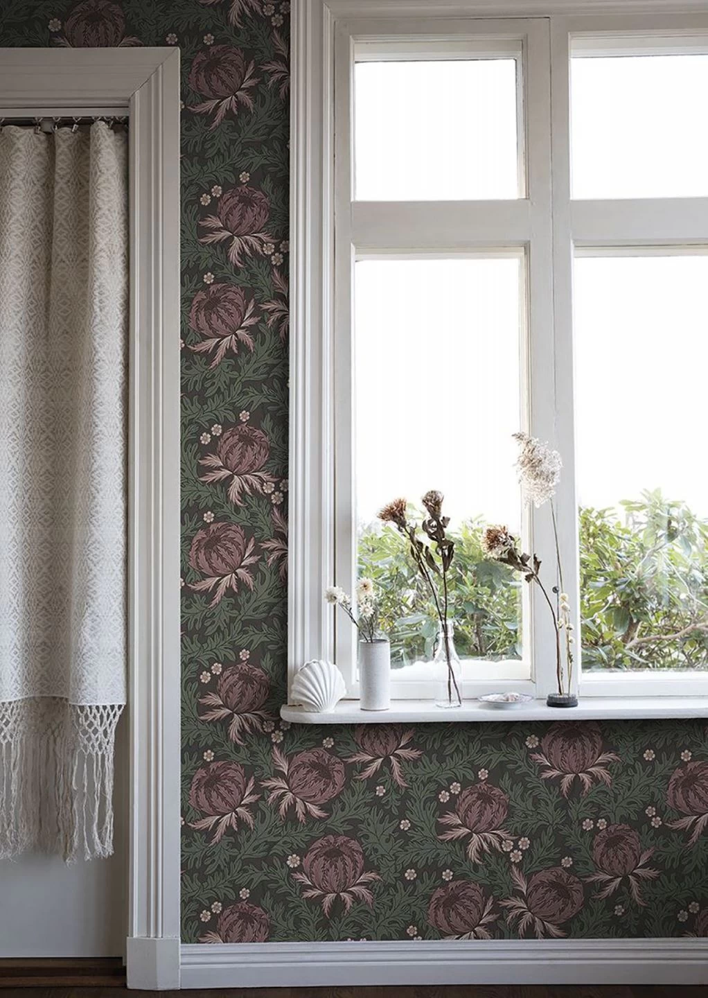 Kraftvolle, kunstvoll gestaltete Blüten stehen hier im Mittelpunkt. Dicht von den grünen Blättern umgeben, heben sich ihre Violett-Töne angenehm vom dunkelbraunen Untergrund ab. Hier und da lockern kleine, helle Blumen das Bild der Vliestapete auf. Das florale Design passt ausgezeichnet zu weißen Einrichtungselementen und betont mit seinen Anklängen an den Jugendstil den klassischen Charme von Vintage-Möbeln.