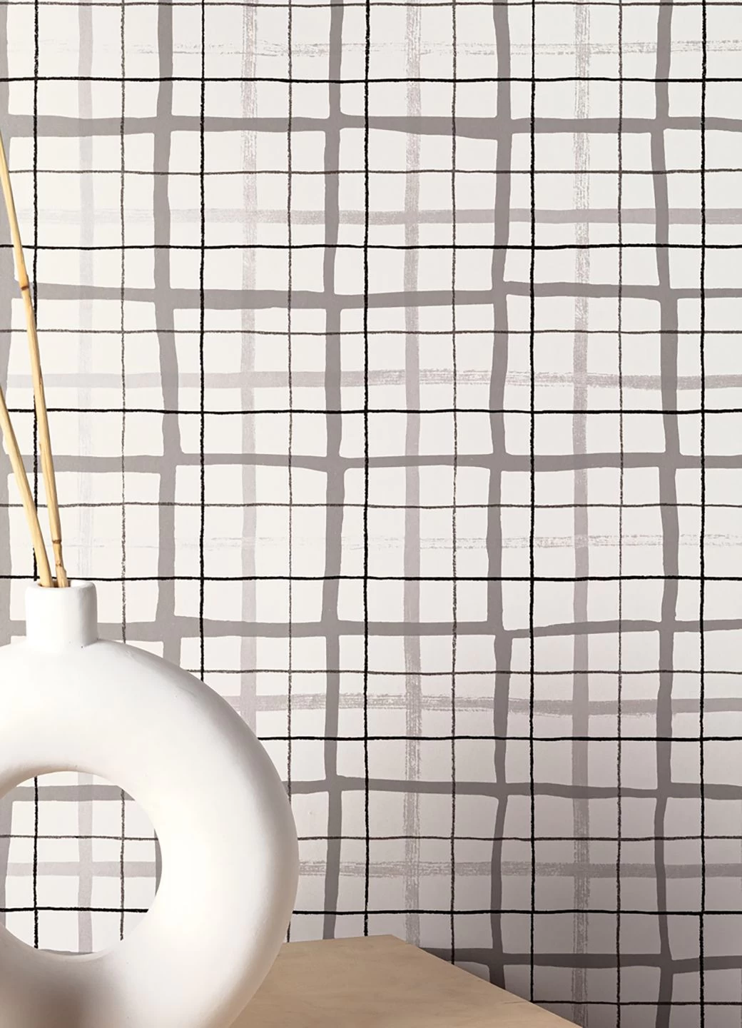 Augenzwinkernd spielt das Design der Tapete Betula mit der Tradition des Karomusters. Denn die verschieden breiten Linien in Grautönen und Schwarz wirken sympathisch handgemalt. Das monochrome Muster bietet dem Auge Halt und Ordnung, ohne streng oder einengend zu wirken. Die grauen Farben lassen ganz unterschiedliche Kombinationen zu – ob mit weiteren Non-colours oder auch im Kontrast mit bunten Farben.