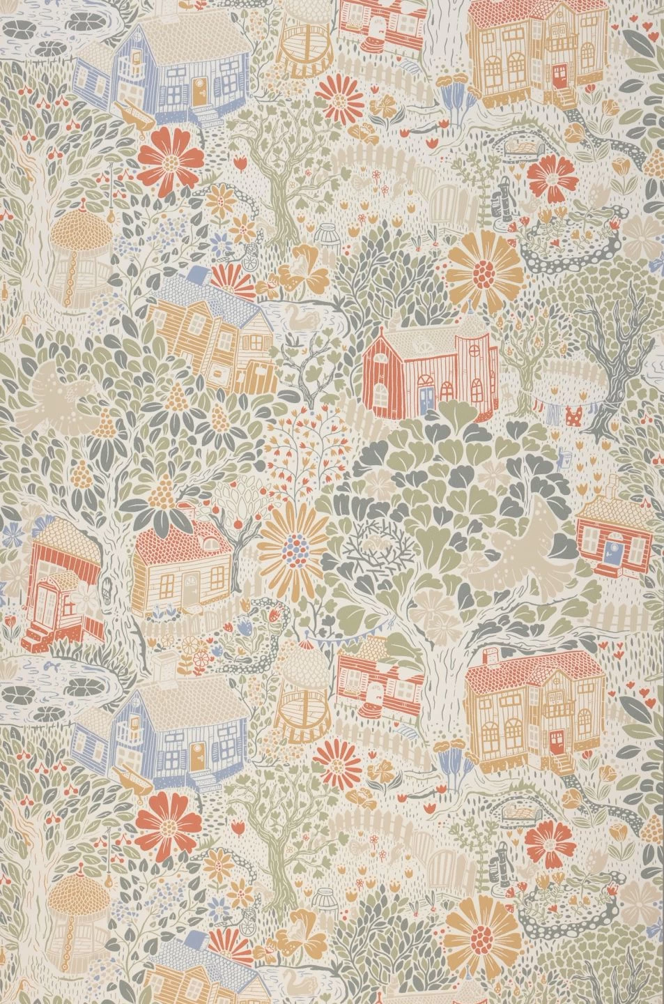 Eine ganze Welt voll von buntem Leben erwacht an Ihren Wänden und unterhält Sie mit ihrer Fülle an liebevoll gezeichneten Details. Wie in einem schwedischen Dorf finden sich hölzerne Häuser und eine Kirche, Bäume und Blumen, ein Seerosenteich, Vögel und noch viel mehr. Der freundliche Charakter der hellen Farbtöne entfaltet in einem hellen Kinderzimmer ebenso seine Wirkung wie in einer einladenden Küche oder einem hyggeligen Wohnzimmer im skandinavischen Stil.
