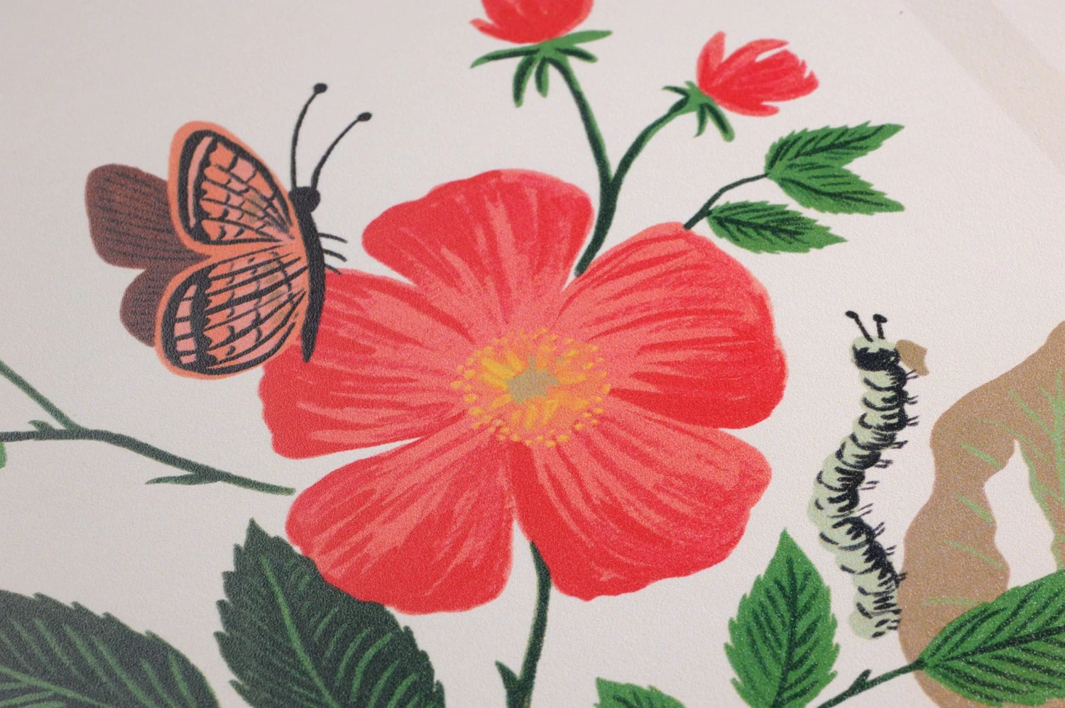 Wie die Illustrationen in einem kostbaren botanischen Nachschlagewerk sind die Blumen hier dargestellt. Bis ins kleinste Detail perfekt gezeichnet und in eleganter Schreibschrift beschriftet, bebildern sie Ihre vier Wände mit einem luftigen und außergewöhnlichen floralen Design. Zusätzliches Leben bringen Schmetterlinge und andere Insekten mit, die die farbenfrohen Abbildungen der Blumen ergänzen.