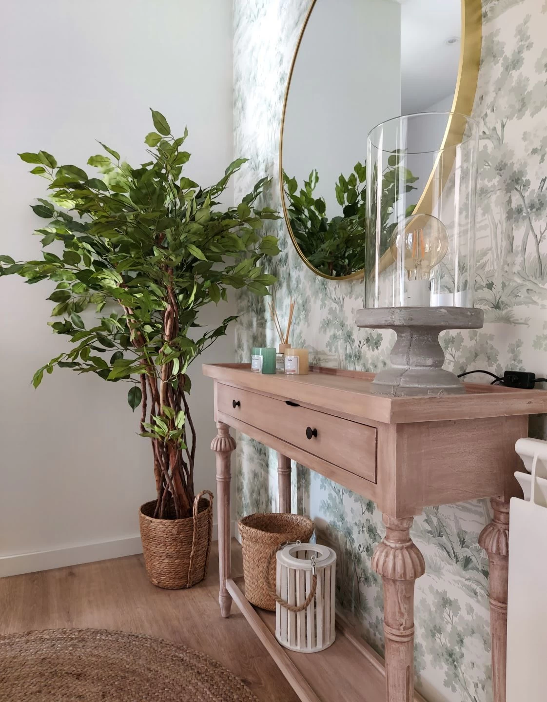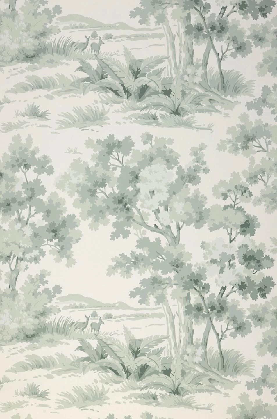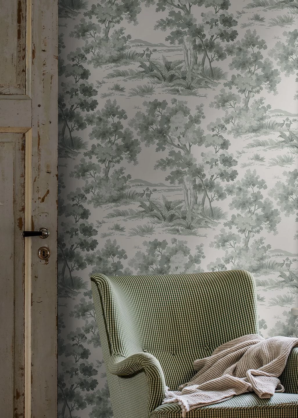 Ganz in verschiedenen Helligkeitsstufen von Mintgrau gehalten, verströmt die Vliestapete „Calobra“ den Charme eines Landschaftsgemäldes, ohne sich durch lebhafte Farben zu sehr in den Mittelpunkt zu drängen. Die dargestellten Wälder, Felder und Rehe bleiben attraktive Kulisse und lassen so vielfältige Kombinationsmöglichkeiten zu. Gerade antike englische Möbel oder eine Einrichtung im Retro-Stil verbinden sich mit der Leimdruck-Tapete zu einer Einheit.