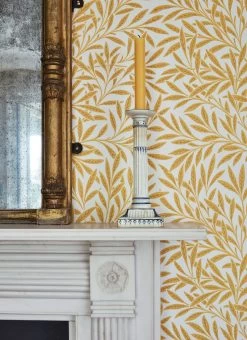 In sonnigem Goldgelb leuchten die feingliedrigen Blätterranken auf dieser im traditionsreichen Leimdruckverfahren hergestellten Papiertapete. Auf dem cremeweißen Hintergrund wirken sie fast schwerelos. Zu antiken dunklen Möbeln im englischen Stil bildet die Tapete einen warmen, strahlenden Hintergrund. Doch auch Einrichtungselemente in Weiß oder in goldener Farbe harmonieren prächtig mit dem kräftig leuchtenden Gelb.