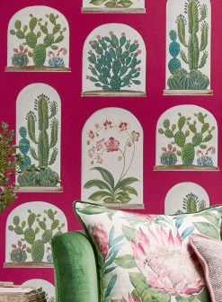 In ferne Gefilde entführt die florale Tapete Coralie. Leuchtendes Rotviolett steht für das feurige Mexico – das Land, in dem die Kakteen blühen. Die ausgefallene Designtapete zaubert ein dekoratives Urlaubsfenster mit exotischem Pflanzencharme, aus dem Sie täglich mit großer Freude der Sonne entgegen sehen.