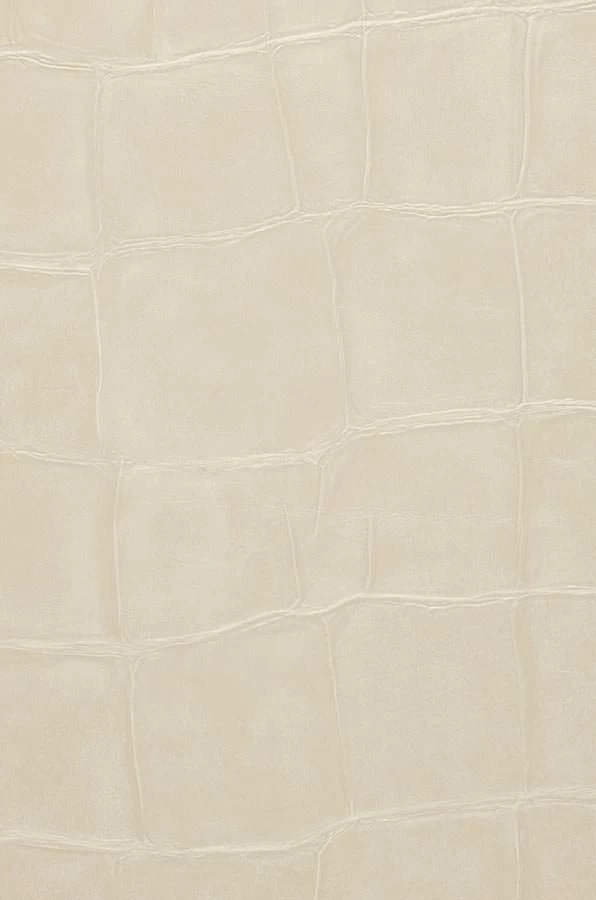 Die große, schuppenartige Narbenstruktur in einem eleganten hellen Elfenbeinton sorgt für die Anmutung echten Krokodilleders. Die Narben sind als fühlbares Relief in die Oberfläche aus Vinyl eingearbeitet, die gleichzeitig hoch waschbeständig ist und dadurch auch für ein schickes Badezimmer verwendet werden kann. Die Leder-Imitation bietet einen geschmackvollen Hintergrund beispielsweise für dunkle Holzmöbel.