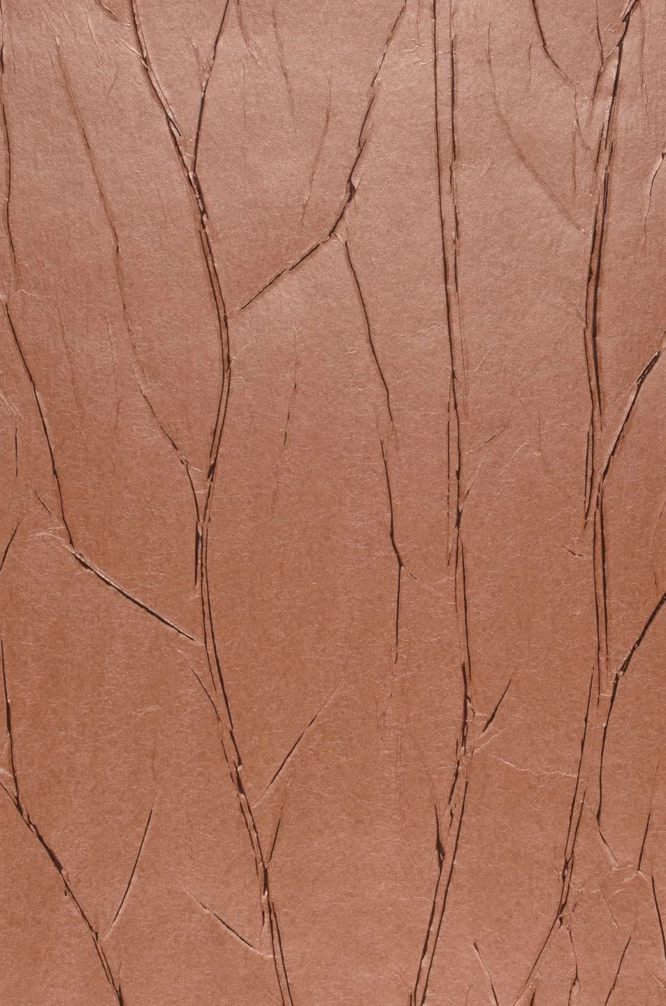 Die fein verästelten Zweige eines Baums, scherenschnittartig vor dem Leuchten des herbstlichen Waldes zu erkennen. Die filigranen Adern eines schon vom Herbst gefärbten Blattes, die sich wie feine, fühlbare Linien abzeichnen. Das Design von Crush Tree 05 ahmt mit seinen Falten Formen und Verläufe der Natur nach. Diesen Eindruck unterstützt auch die Farbe: ein tiefes, warmes Kupferbraun mit leichtem Schimmer, auf dem hauchdünne schwarze Linien den Verlauf der Falten betonen.
