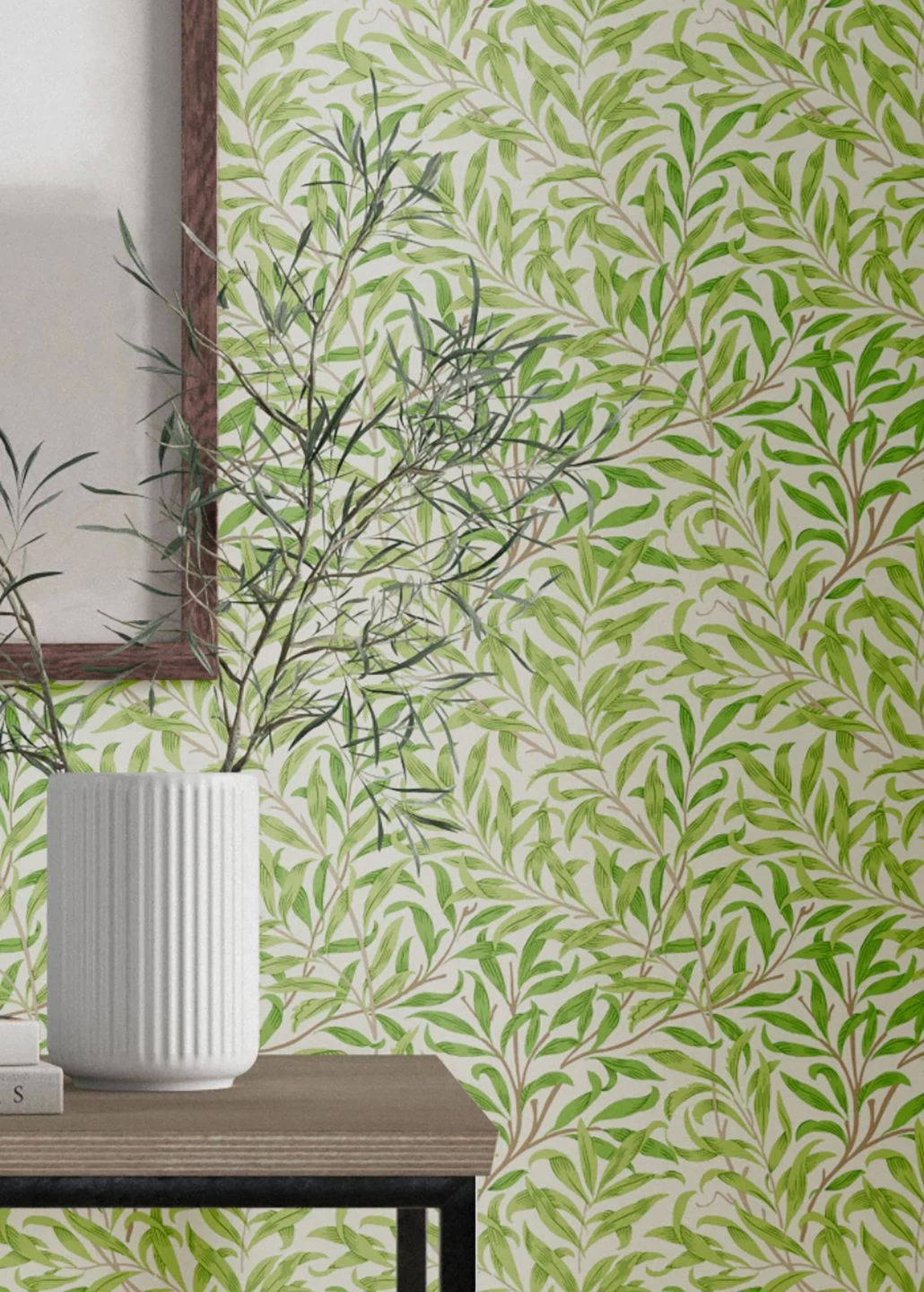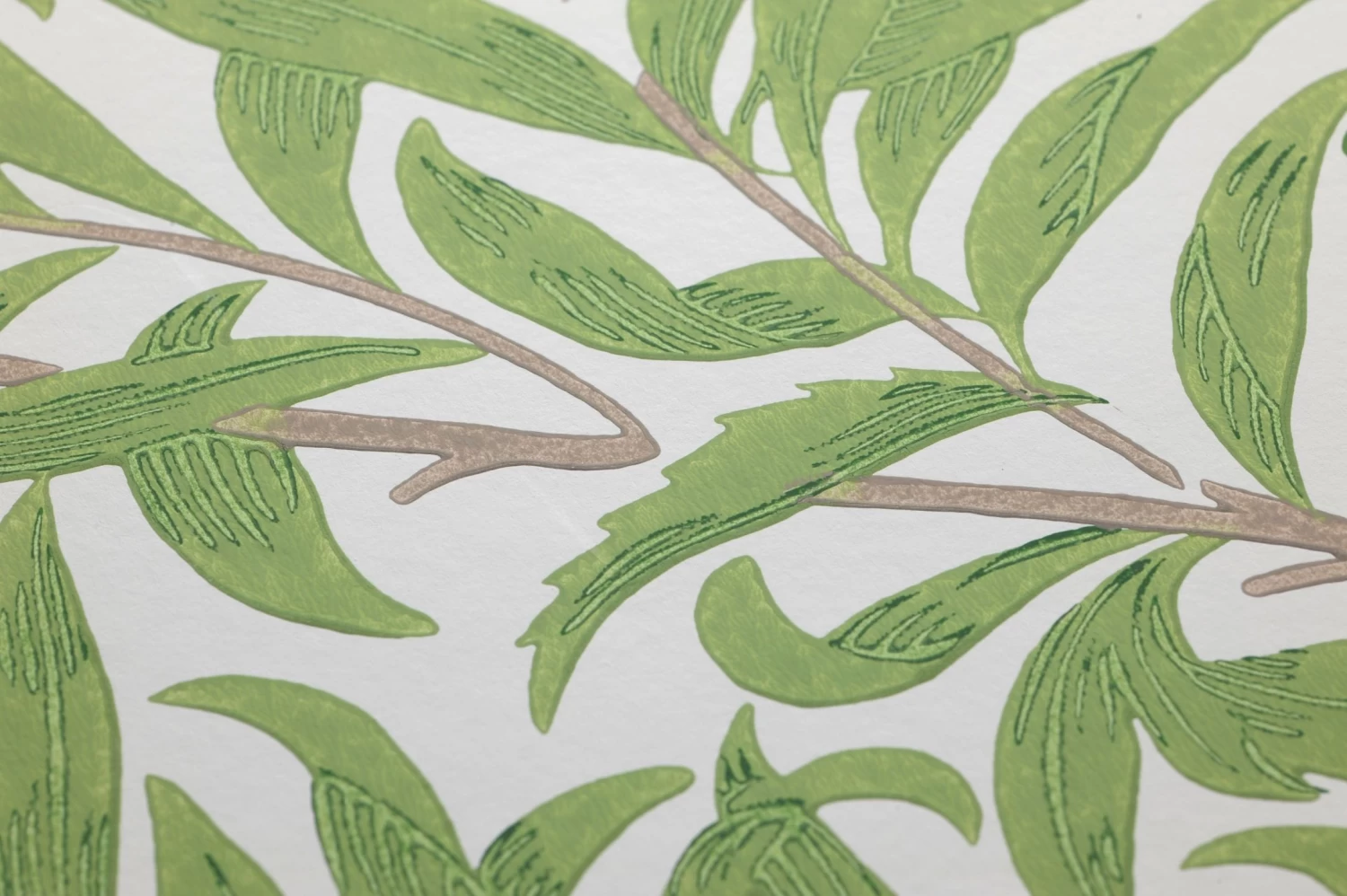 Schmale Weidenblätter an schlanken, biegsamen Zweigen feiern den Frühling mit ihrem leuchtenden Maigrün – so wie die Weide in jedem Jahr einer der ersten Bäume ist, an deren Zweigen sich mit gelblichem Schimmer die jungen Blätter ankündigen. Die leimgedruckte Papiertapete strahlt dazu noch einen kostbaren Retro-Schick aus und verleiht antiken Möbeln oder auch dem Landhaus-Stil frühlingshafte Lebensfreude.
