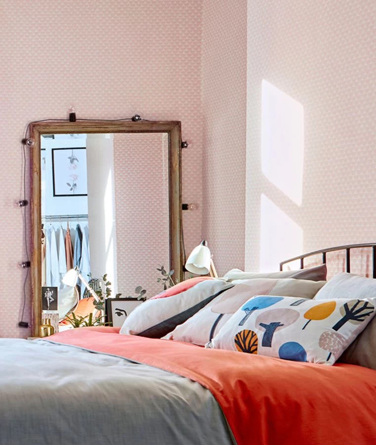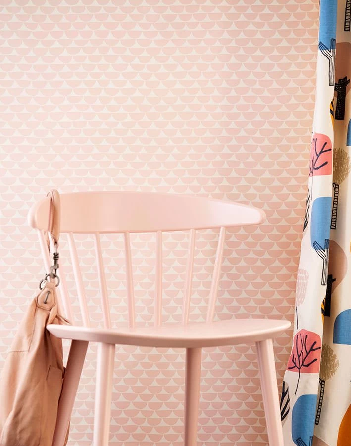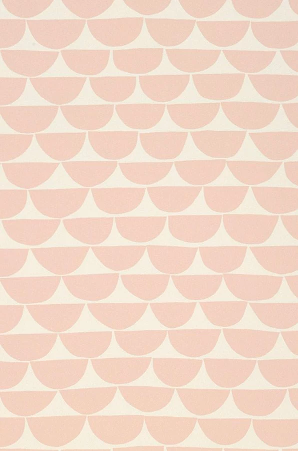 Munter und in Pastellrosa setzen sich die Halbkreise zu einem pfiffigen Muster zusammen, das sich optisch je nach Betrachtungswinkel und Betrachtungsintensität verändert. Mal lassen sich hintergründige Dreiecke erkennen, mal wirken die Halbkreise wie kleine Punkte aus der Ferne – Eine betörende Verlockung für rosa Romantik-Räume.