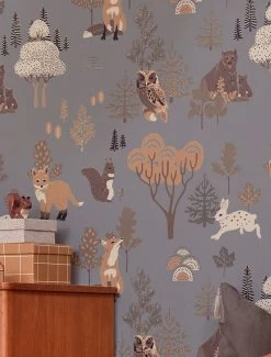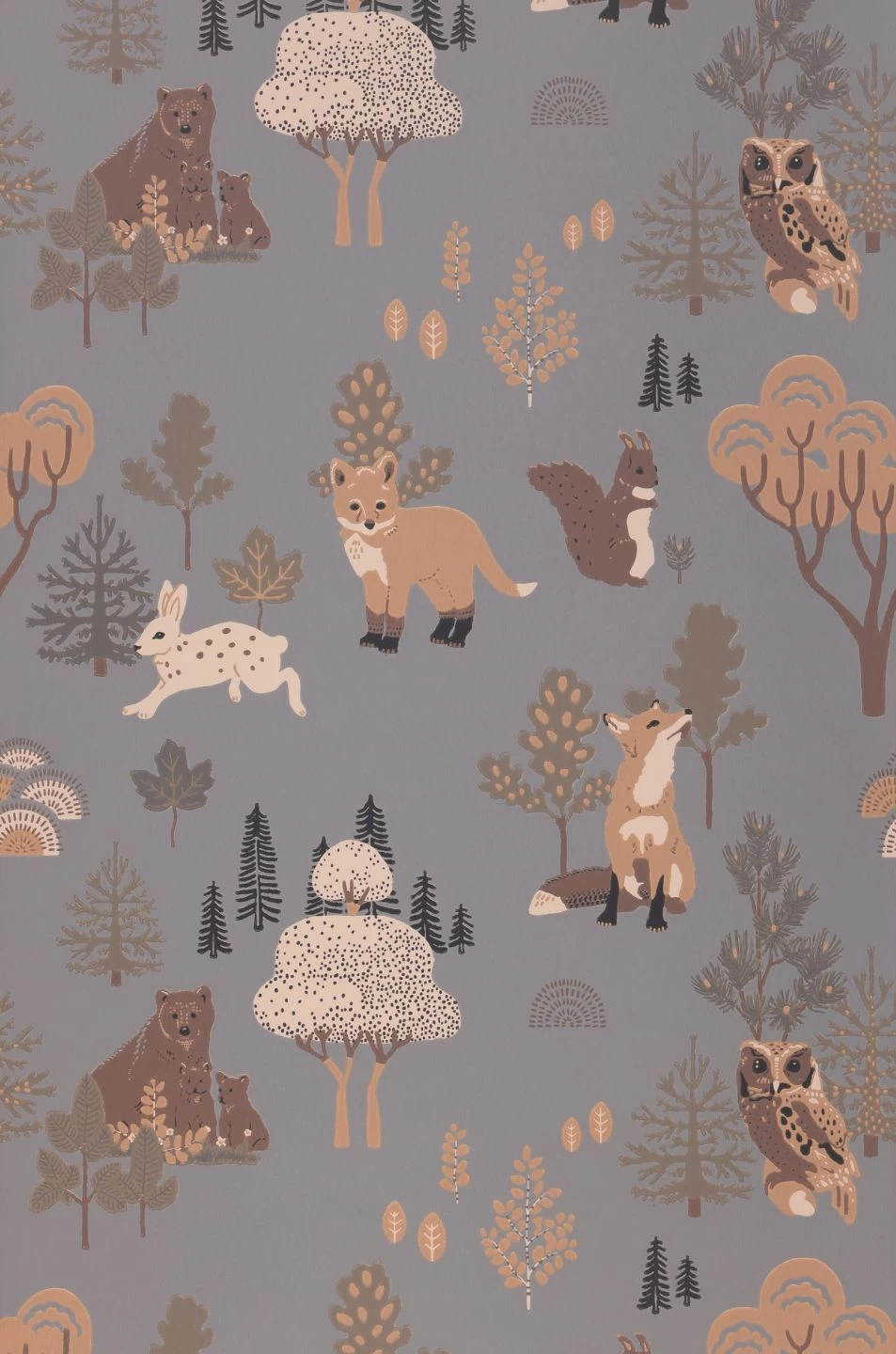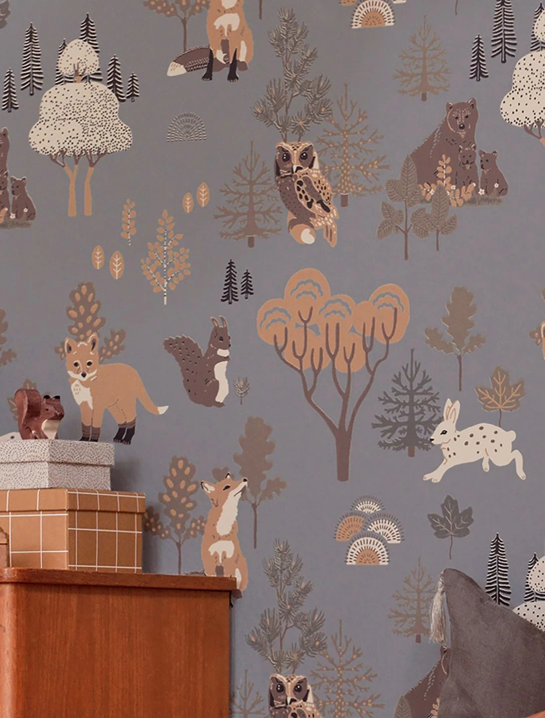 Tief drinnen im Wald verbergen sich Tiere in Hülle und Fülle. Ein Fuchs schnuppert in den Wind, eine Bärenfamilie sitzt im Gras, ein Waldkauz hockt auf einem Zweig. Dazwischen stilisierte Bäume und Büsche. Die schöne Vliestapete aus dem Hause Majvillan, hergestellt im traditionellen Leimdruckverfahren, nimmt Ihr Kind mit auf einen Waldspaziergang, auf dem es viel zu entdecken gibt. Die Beige- und Brauntöne strahlen in Verbindung mit dem blaugrauen Grund angenehme Ruhe aus.