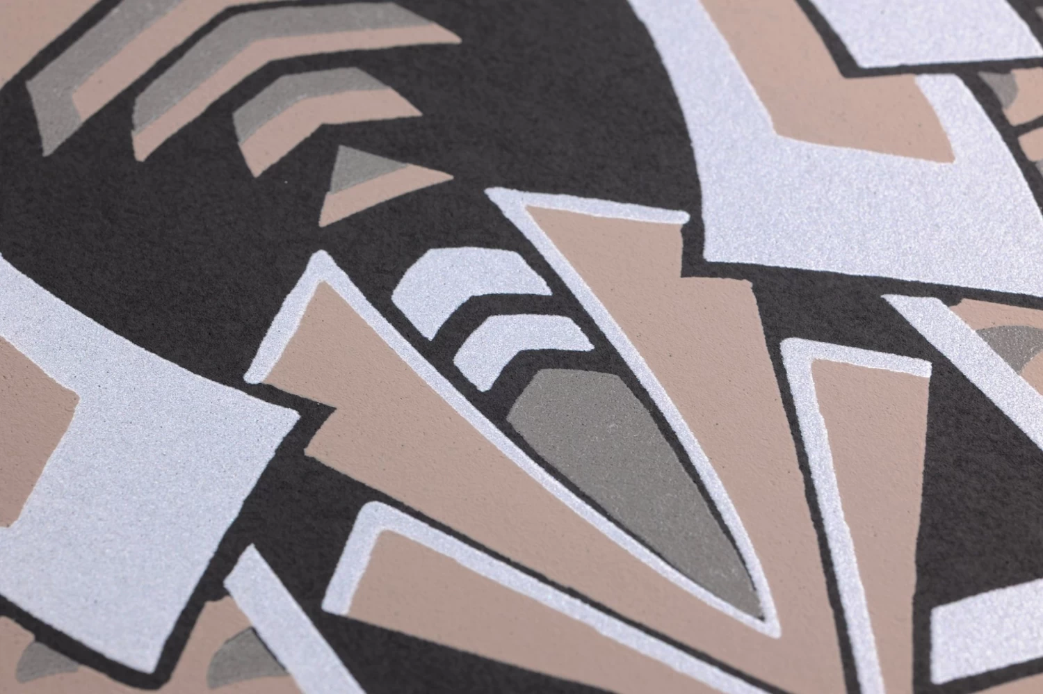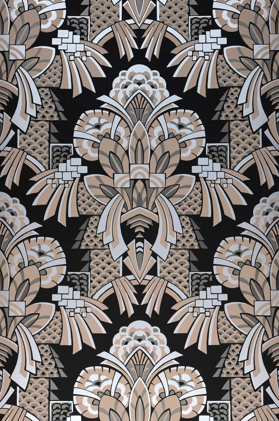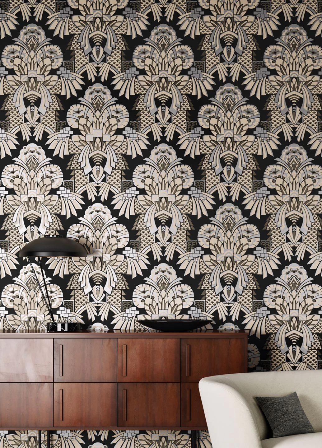 Fantastische Ornamente, von der Flora inspiriert und mit Grafik verfeinert, wirken wie Siegerschleifen, welche die Wand prachtvoll schmücken. Das keineswegs zurückhaltende Art Deco Muster in Silber und Grautönen vereint Kunstfertigkeit und Moderne, seine dominante Präsenz verlangt nach Aufmerksamkeit und Simple Chic bei den Möbeln.