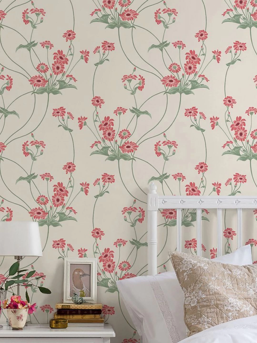Die Mustermischung aus Orientrot, Purpurviolett und Schilfgrün signalisiert knackige Dynamik, die ihre Portion Romantik durch die grafische Darstellung nach Jugendstil-Art erhält. Rot ist die Farbe der Liebe und Lieblichkeit, die sich auch auf der hochwertigen Papiertapete mit Leimdruck-Optik widerspiegelt.