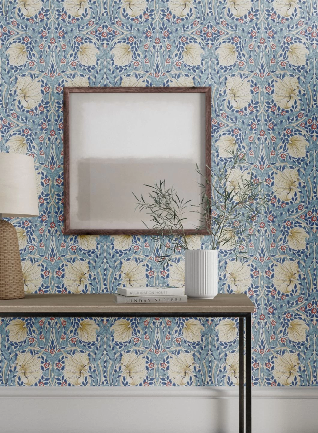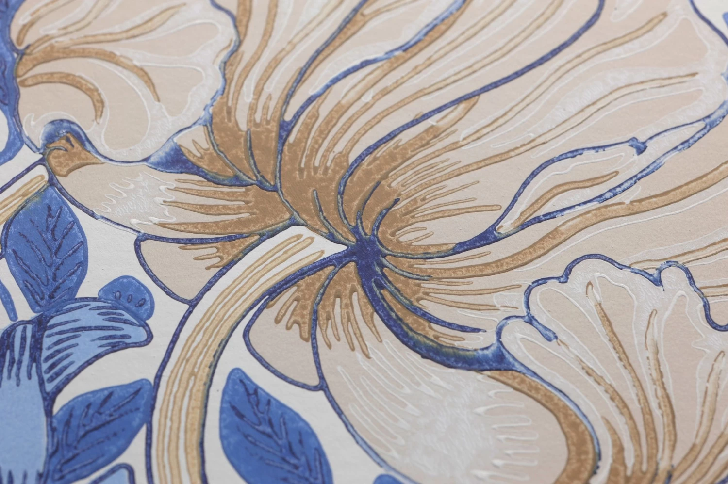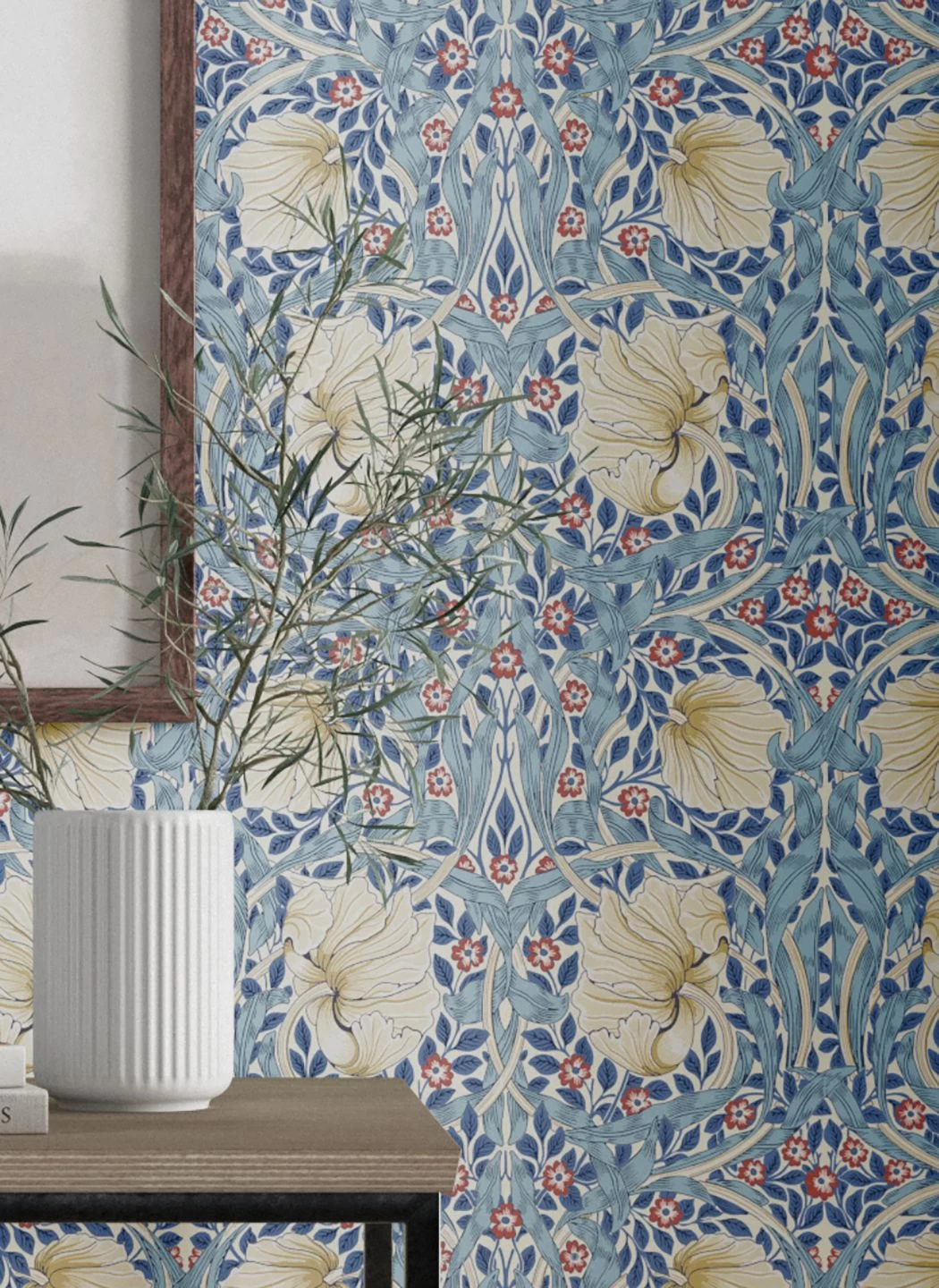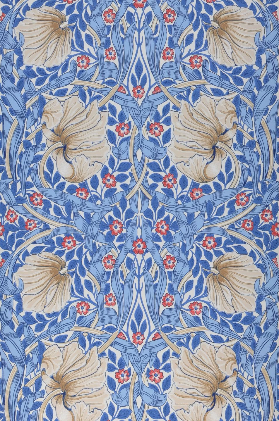 Im Mittelpunkt stehen bei diesem Design des britischen Künstlers und Designers William Morris die großen, wie Mohnblumen geformten Blüten. Sie neigen sich vom Betrachter weg und lenken den Blick auf den Hintergrund, ein komplexes Muster aus rotweißen Blüten und Blattranken in Blautönen auf dem weißen Grund. Die Jugendstil-Tapete ist im Leimdruckverfahren hergestellt, was dem Farbauftrag eine unverkennbare, handgemachte Optik verleiht.