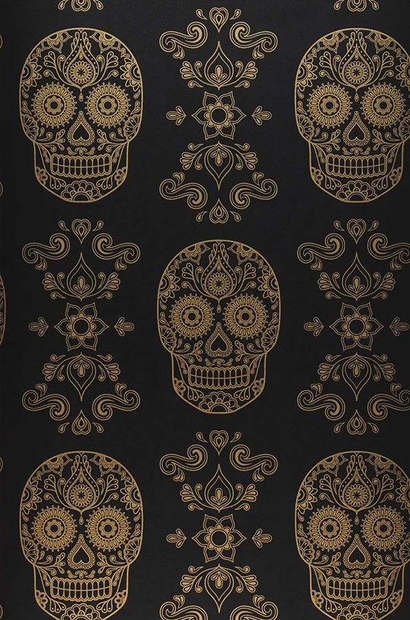 Wo immer diese Totenköpfe das Licht im Raum erblicken, erstrahlen sie in glamourösem Goldglanz. Raffiniert, bizarr und von spiritueller Eleganz zeigt sich die extravagante Muster Tapete, die mexikanisch inspirierte Skulls mit stilvollen floralen Elementen mixt. Mondänes Schwarz sorgt für emotionale Tiefe.