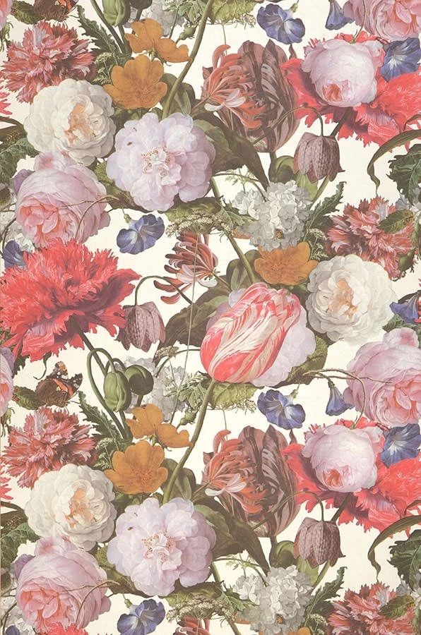Die bunten Farben der prächtigen Blüten auf dieser Vliestapete entfalten auf dem cremeweißen Untergrund ihre ganze Leuchtkraft. Komposition und Darstellung der Blumen erinnern an die Stillleben der holländischen alten Meister des Barock. Die textilähnliche Struktur der Oberfläche aus Vinyl trägt zum Eindruck eines Gemäldes bei und sorgt dafür, dass Sie mit dieser hoch waschbeständigen Tapete auch Ihr Bad verschönern können.