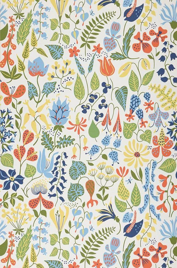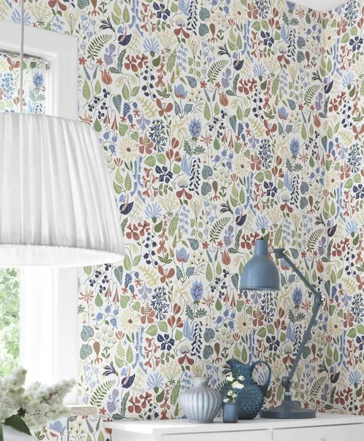 Eine ungeheure Vielfalt von stilisierten Blumen zieht mit „Eurynome“ in Ihre vier Wände ein. Glockenblumen und Tulpen, Fingerhut und Hyazinthen, dazwischen Blätter in den verschiedensten Formen, bringen die Fülle des Sommers mit. Die klaren Blau-, Rot- und Gelbtöne auf dem weißen Grund der Vliestapete strahlen Frische, Leichtigkeit und Lebensfreude aus. Zusammen mit Einrichtungselementen in Weiß oder einer der Musterfarben unterstreichen Sie die Wirkung.