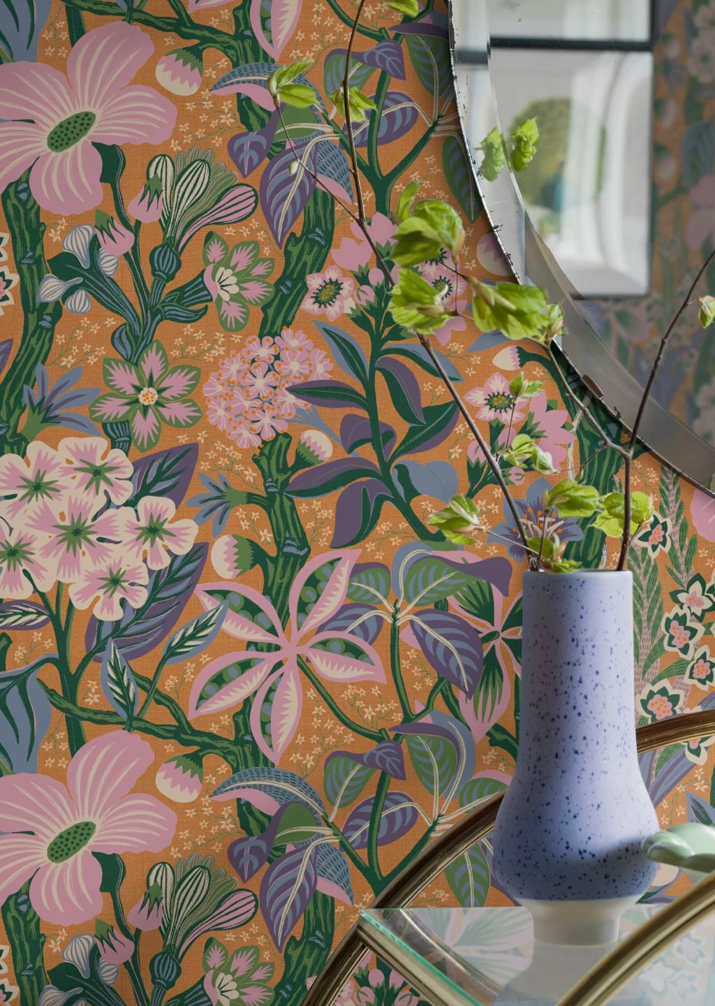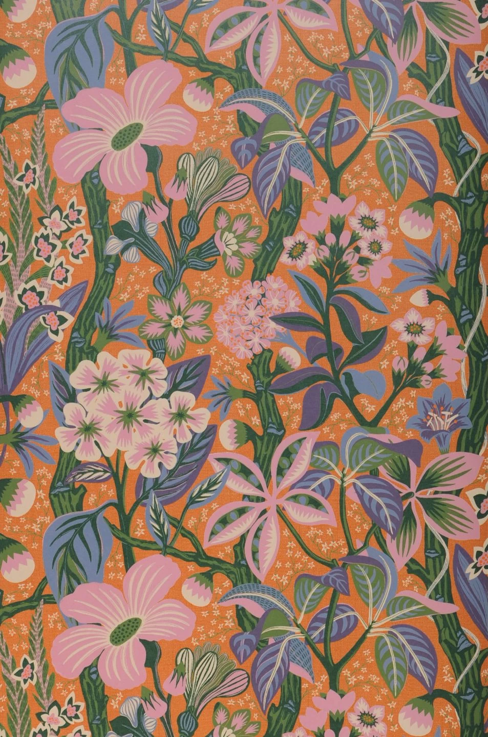Raumgreifende Blüten mit fantastisch geformten Blättern erfüllen Fanfara mit üppigem, fast psychedelisch anmutendem Leben. Die hellen Rosa- und Elfenbeintöne der Blüten, das Taubenblau, Dunkelviolett und Grün der Blätter und Ranken verbinden sich mit dem orangefarbenen Untergrund zu einer energiegeladenen Mixtur, die an die kühnen Farbkombinationen der 70er Jahre erinnert. Fanfara verträgt charaktervoll geformte Möbel, die ihrer Ausdruckskraft etwas entgegensetzen.