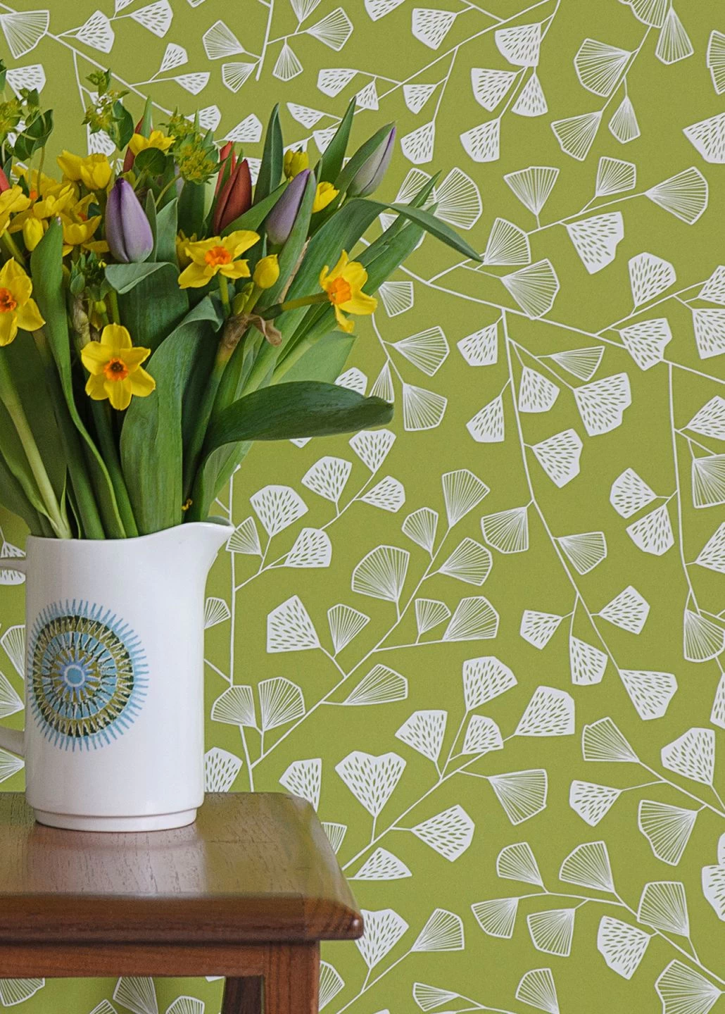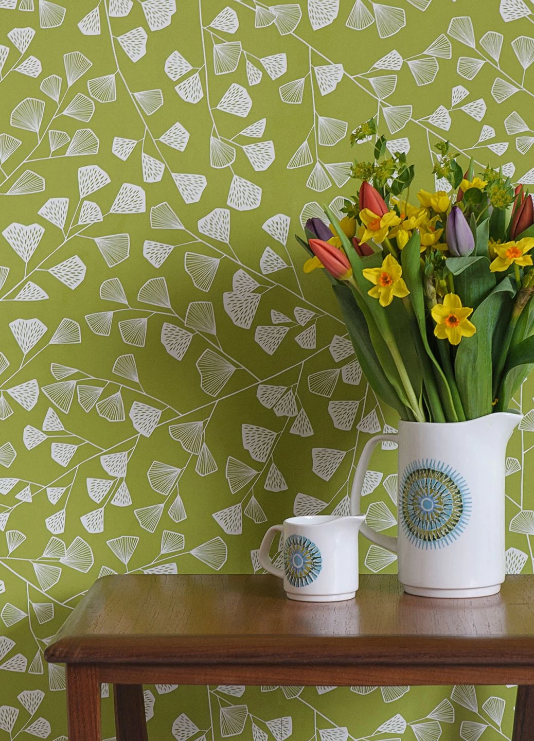 Stilisierte Blätter wie die einer tropischen Farnpflanze ranken sich über diese Vliestapete, die einen frühlingshaften Farbton in Ihren Raum bringt. Die abstrakt dargestellten Blätter werden nur durch zarte weiße Schraffuren angedeutet. Der freundliche Untergrund in Hellgrün verstärkt die Atmosphäre des Frühlings, die von der Tapete ausgeht.