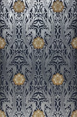 Ein kunstvolles Jugendstil-Muster aus silbern schimmernden stilisierten Blättern und Blüten auf dunkelblauem Grund umgibt regelmäßig angeordnete Blüten, die sich mit ihrem Braunbeige und Cremeweiß vom Rest des Designs abheben. Das Zusammenspiel der verschiedenen Farbfamilien und der schimmernden und matten Ornamente vereint Gegensätze und macht Papiertapete Gatsby zu einem interessanten Schmuck für einen schick gestylten Raum.