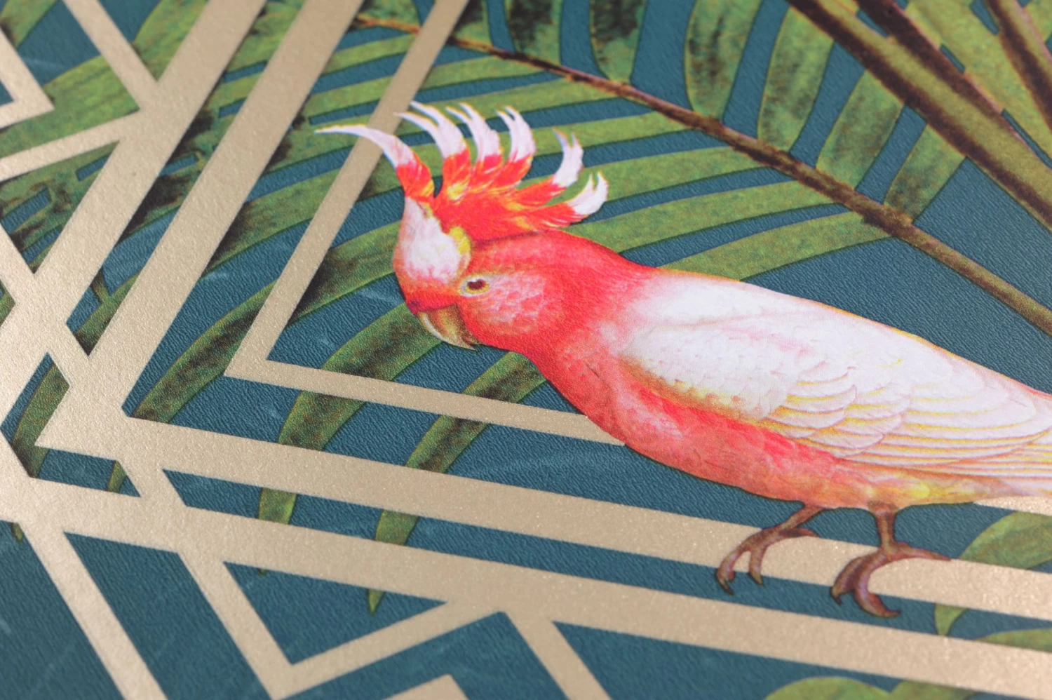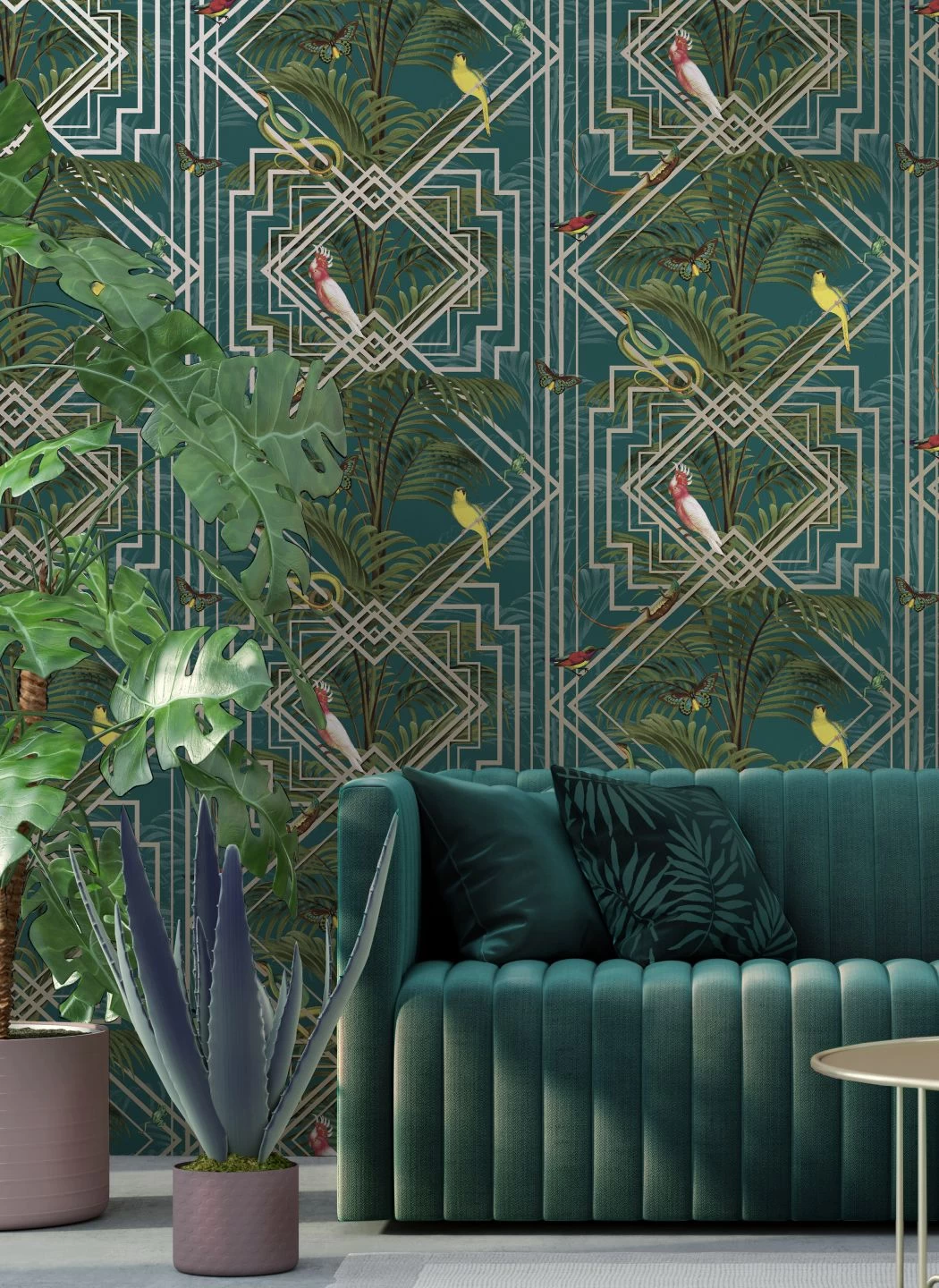 In einer Synthese aus Art Deco und Naturdarstellung kreiert die Papiertapete Grace ihre ganz eigene Ästhetik. Wie an einem Gitter wachsen an den charakteristischen geradlinigen und verwinkelten Ornamenten des Art Deco Palmwedel in die Höhe, realistisch gezeichnete Kakadus und Sittiche sitzen auf den Streifen des Dekors, und Echsen klettern daran. So verschwimmen Vordergrund und Hintergrund, Bildliches und Abstraktes zu einer phantastischen Welt.