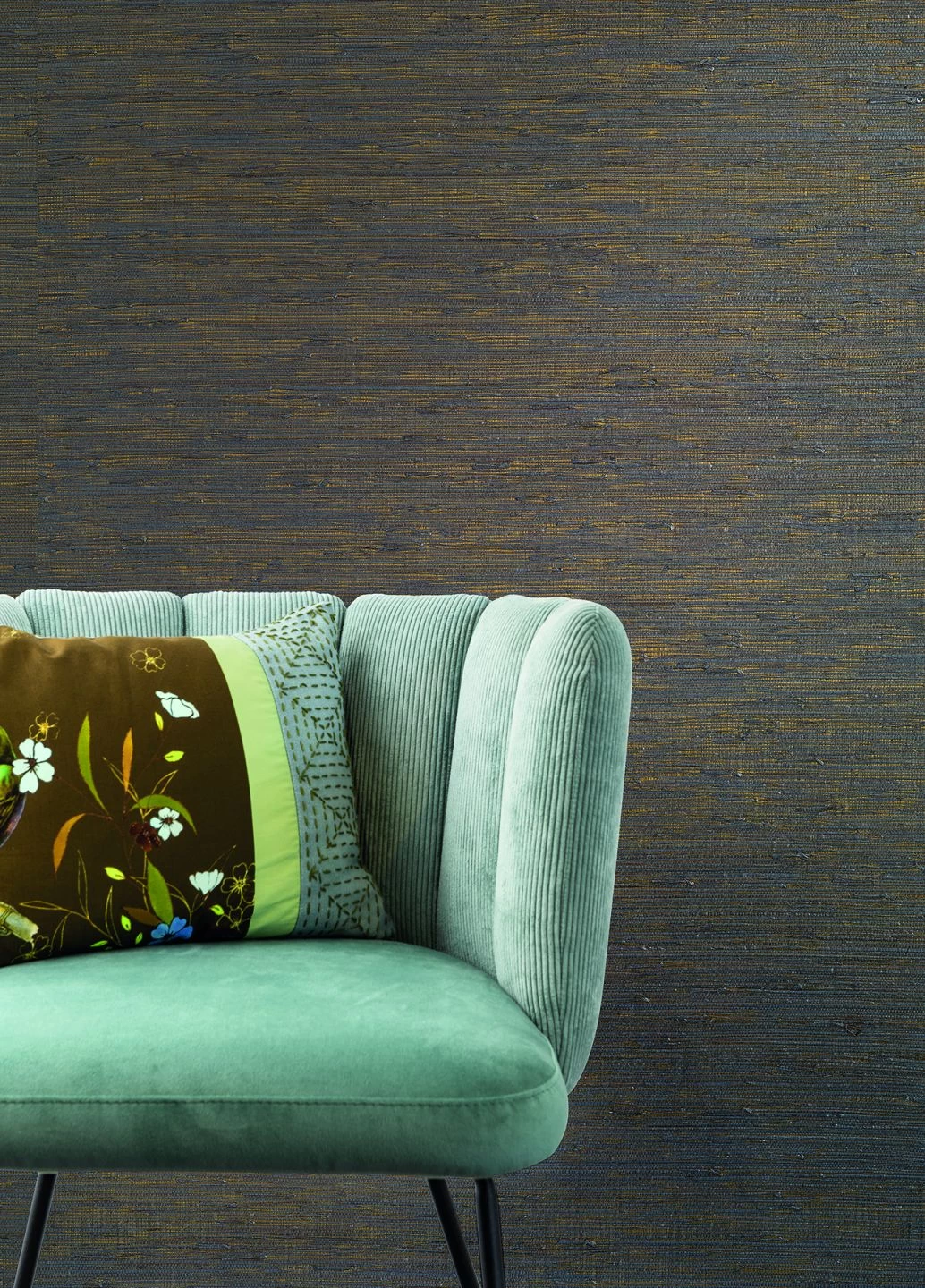 Die natürliche, ungleichmäßige Struktur des verwobenen Materials – getrocknete Gräser von Feldern und Bergwiesen – wird durch die schimmernden Grau- und Goldtöne betont. Nicht nur haptisch, sondern auch optisch ist das Grasgewebe eine echte Besonderheit. Das Naturmaterial sorgt für Geborgenheit und einen Hauch von Glamour in einem angenehmen Raumklima.