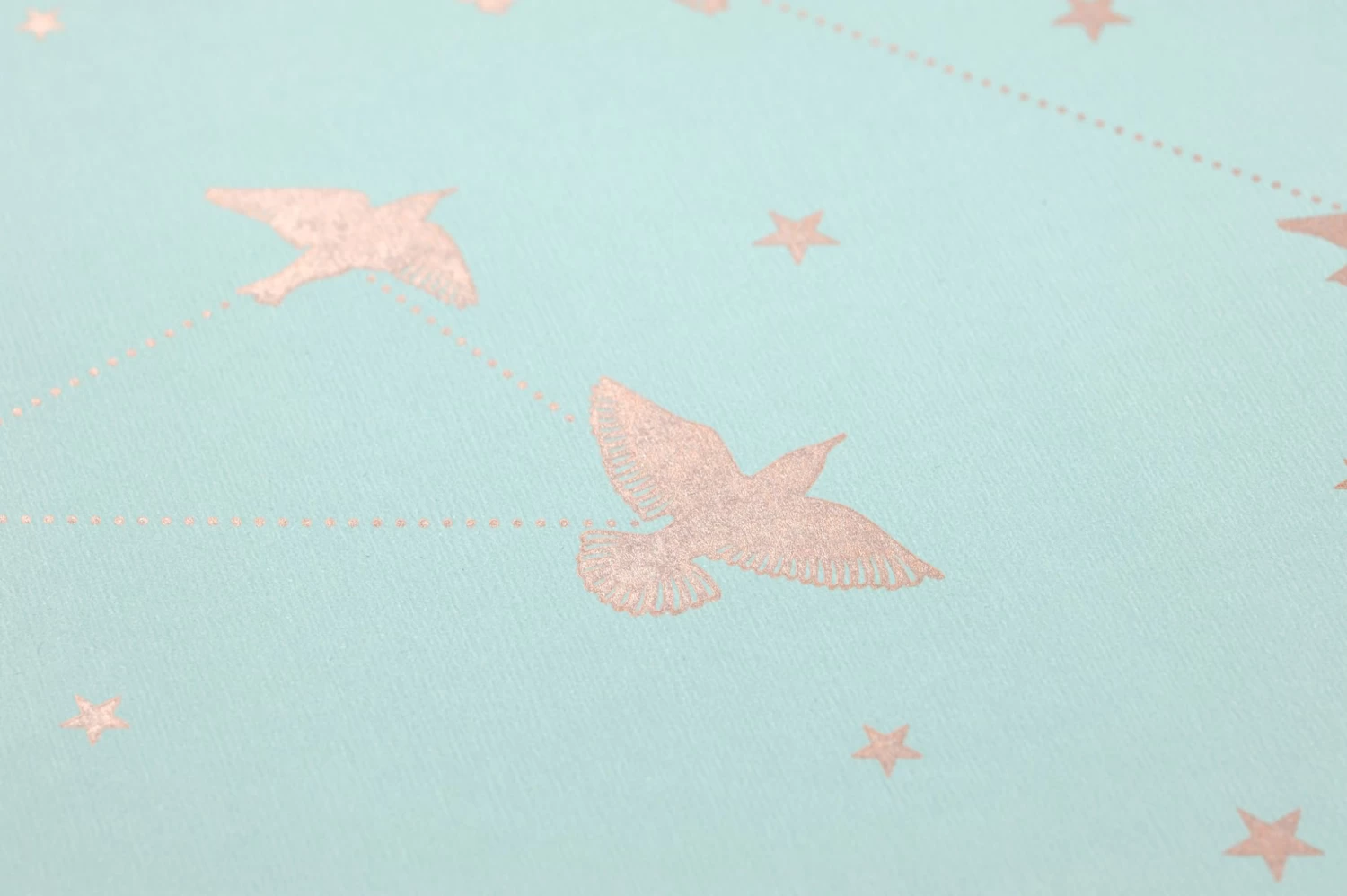 Die reizende Romantik Tapete setzt auf abstrakte und konkrete Bilder und spricht dabei Bände. Himmelszelt, Sternenbilder und Vogelfreiheit symbolisiert die Designtapete in Pastellgrün und Rosenholz. Sternschnuppen zeigen sich, wenn das schimmernde Muster vom Sonnenlicht geküsst wird.
