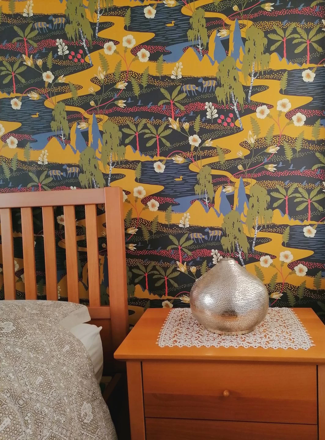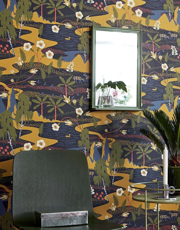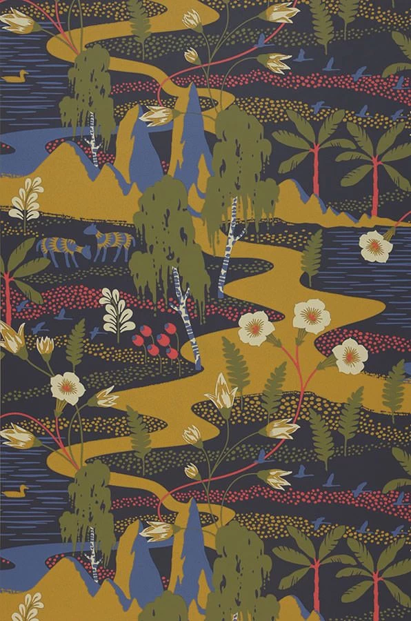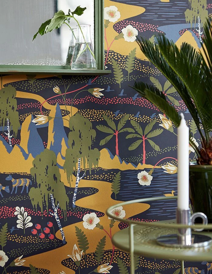 Auf Reisen gehen, ist mit Design Tapete Hesperia nicht schwer. Tiefe Täler, hohe Berge, tropische Kokospalmen, kleine Seen und blühende Landschaften warten darauf, den Raum zu füllen. Das eindrucksvolle Motivmuster in kontrastreichen Farben wirkt kunstvoll abstrakt und erschafft für das Auge eine dynamische Struktur.