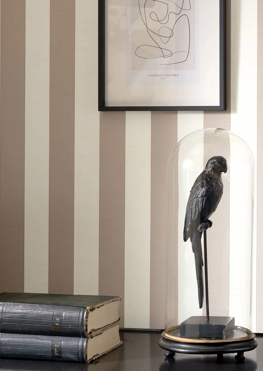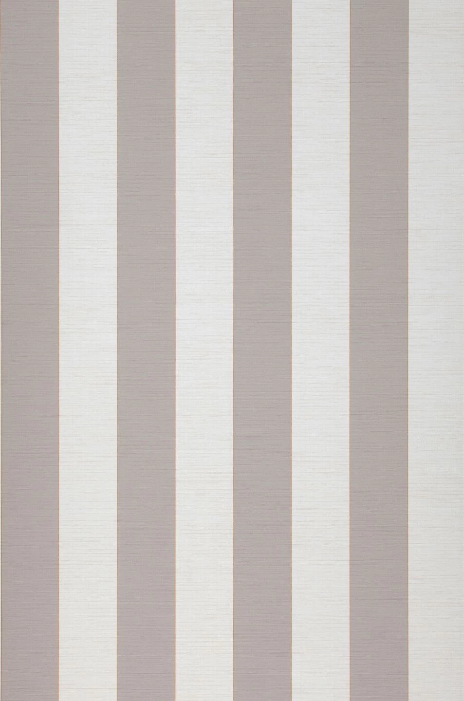 Breite Streifen in Beigegrau und Weiß werden durch schmale, bronzefarben schimmernde Linien voneinander abgesetzt. Die Wirkung einer eleganten Textiltapete entsteht durch die feine, textilähnliche Struktur der Vinyloberfläche. Die Tapete bietet antiken Möbeln in dunklen Holztönen einen klassisch-eleganten Hintergrund, lässt sich durch ihr scheuerbeständiges Material aber auch in Ihrem Bad wirkungsvoll einsetzen.