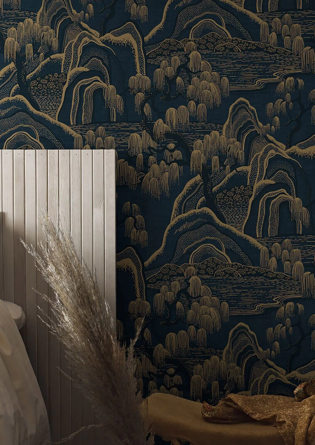 Nur aus Linien, Punkten und Tupfern von Goldfarbe und Schwarz entsteht auf dem ins Blaue spielenden Anthrazitgrau des Hintergrunds eine japanische Parklandschaft. Berge, Bäume mit hängenden Zweigen, Blumen und stille Teiche werden nur angedeutet. Die Tapete lebt vom Kontrast des schimmernden Goldes zum dunklen Grund und nimmt Sie mit auf eine Reise durch Raum und Zeit ins Reich der japanischen Ästhetik.