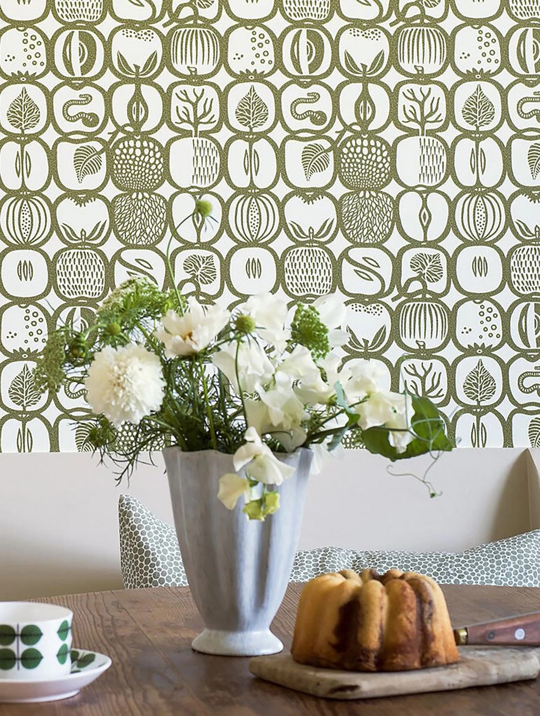 Im sparsamen Zeichenstil von Piktogrammen gehalten, übt diese Tapete eine Faszination aus, der sich niemand entziehen kann. Stilisierte Abbildungen von Äpfeln bedecken sie ganz und gar. Doch bei näherem Hinsehen ist jeder Apfel anders. Mehr oder weniger rund, mit verschiedenen Mustern, mal halbiert, mal angeschnitten, einer trägt ein Blatt, ein anderer zeigt einen Baum. So spielen die Illustrationen alle Phasen der Entwicklung von Äpfeln durch und geben Ihrer Küche einen modernen, individuellen Touch.