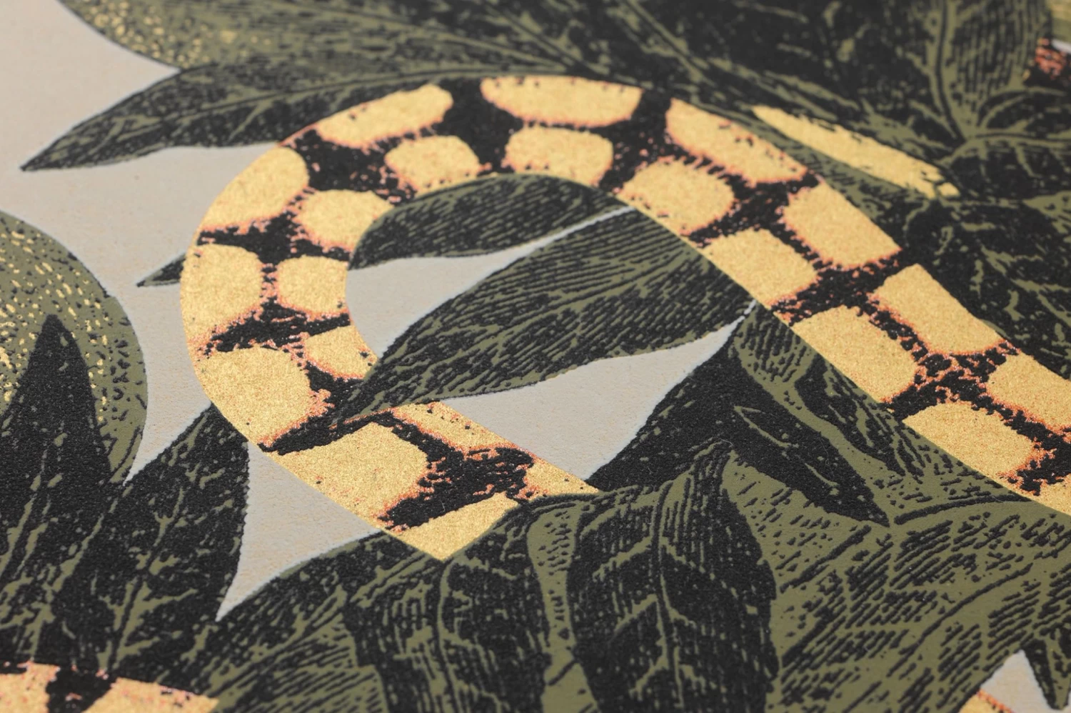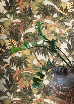 Ein tropischer Garten Eden voller exotischer Blätter und Früchte – und mit Schlangen, deren bunte Farben zwischen den Grün- und Olivtönen hervorleuchten. Das Muster ihrer Schuppen wird betont durch schimmernde Highlights in Hellgelb und Hellbraun. Zu dunklen Holzmöbeln bildet die Vliestapete ein attraktives Gegengewicht und einen lebhaften Hintergrund.