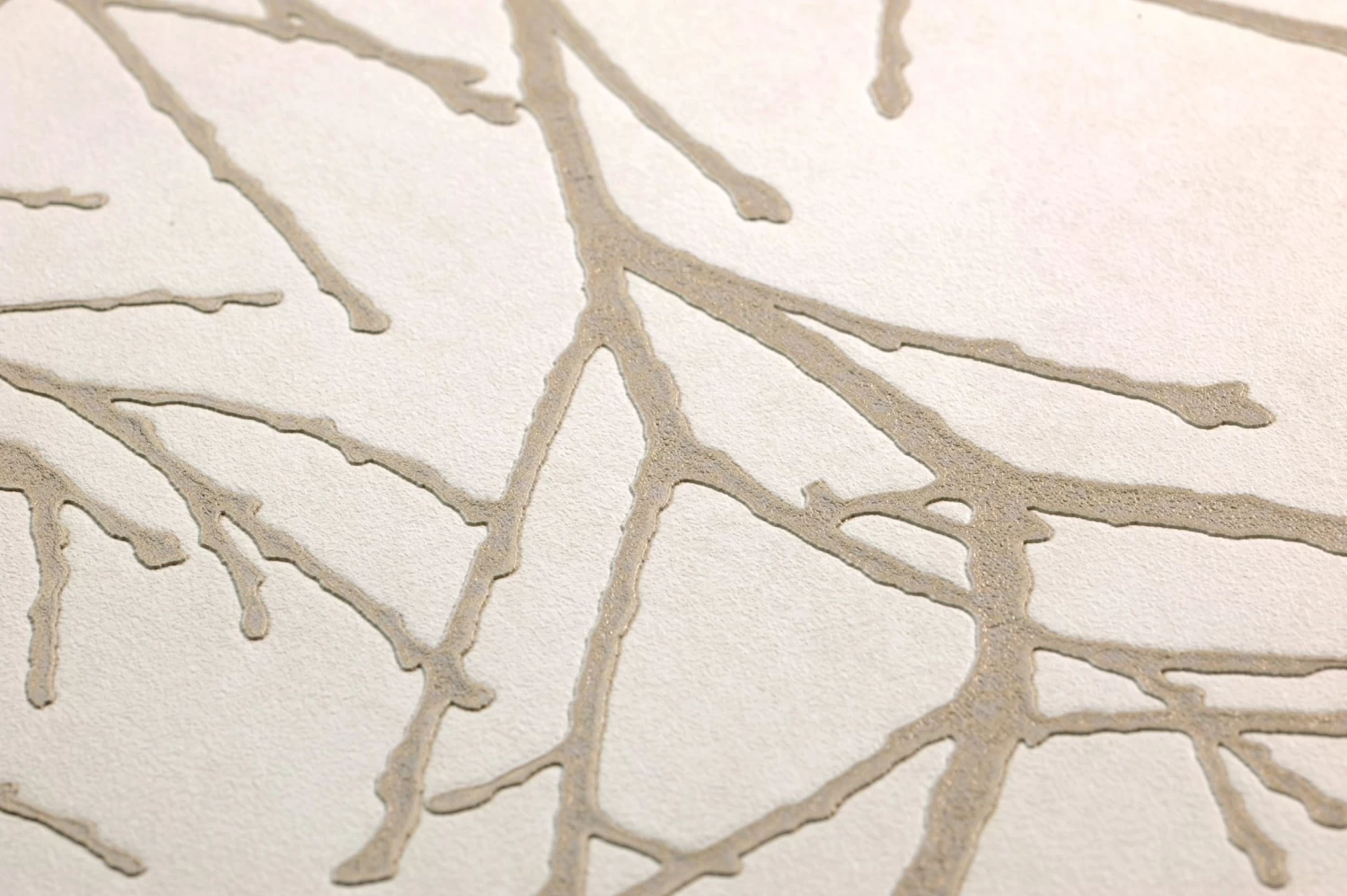 Realistisch anmutende Zweige treten spürbar erhaben aus dem Vinyl der Tapetenoberfläche hervor. Der geringe Kontrast zwischen dem Perlhellgrau und Perlbeige der Zweige und dem weißen Grund der Tapete lässt sie schlicht und geheimnisvoll wirken wie an einem nebligen Morgen, kurz bevor die Sonne durch den Nebel dringt. Die Ästhetik von Kansai harmoniert prächtig mit dem minimalistischen asiatischen Einrichtungsstil.