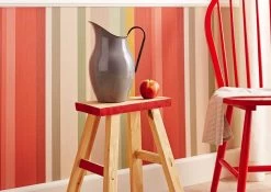 Sommerlich bunte Streifen verschiedener Breite werden noch betont durch die fühlbar textilähnliche Struktur der Vinyloberfläche. Die Rot-, Grün- und Beigetöne machen die Vliestapete vielseitig kombinierbar. Ob Sie die farbigen Streifen senkrecht oder quer verlaufen lassen, ist ganz Ihnen überlassen. Die Tapete ist hoch waschbeständig und macht auch Ihr Bad zu einem sonnigen, fröhlichen Ort.