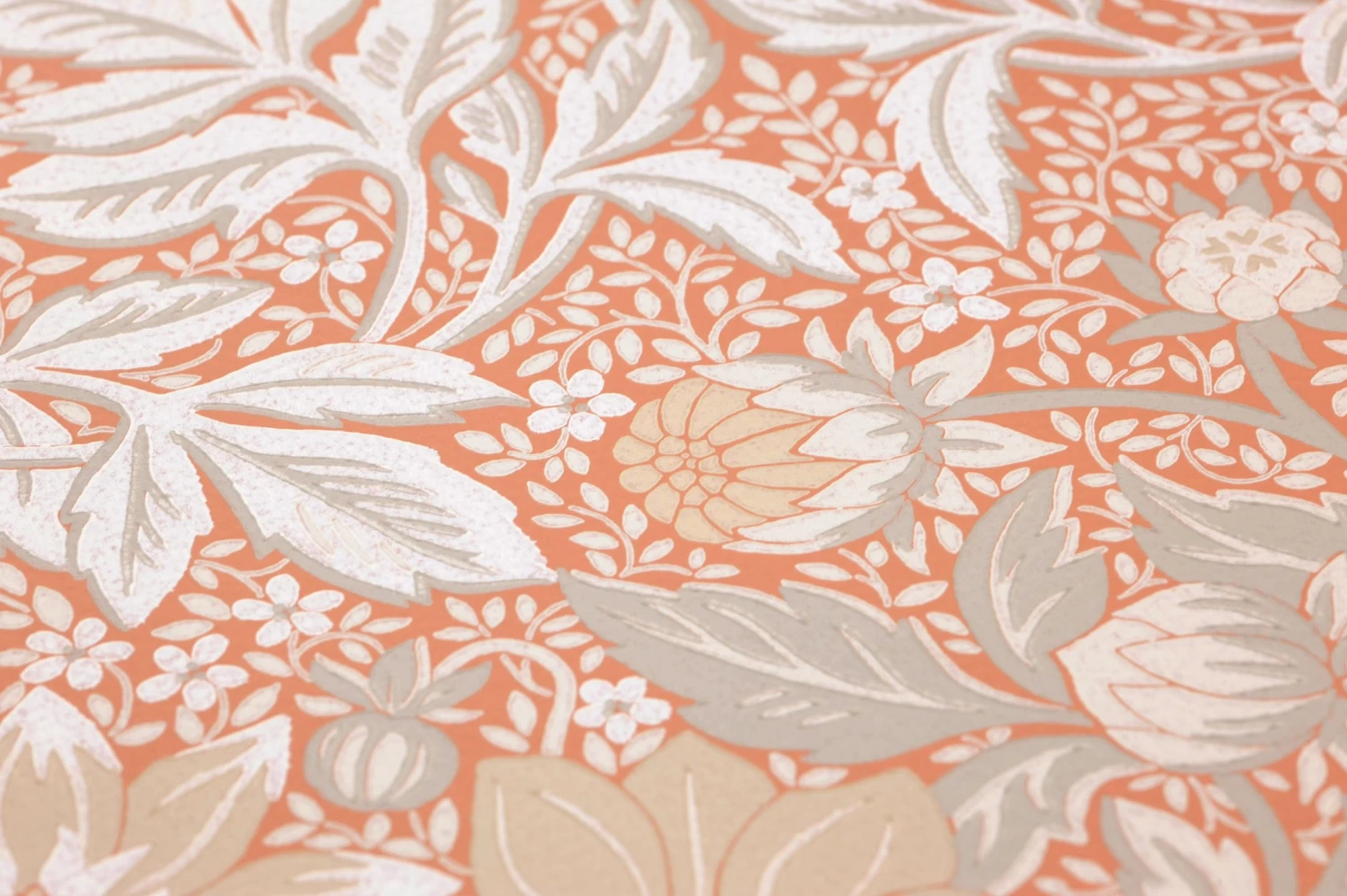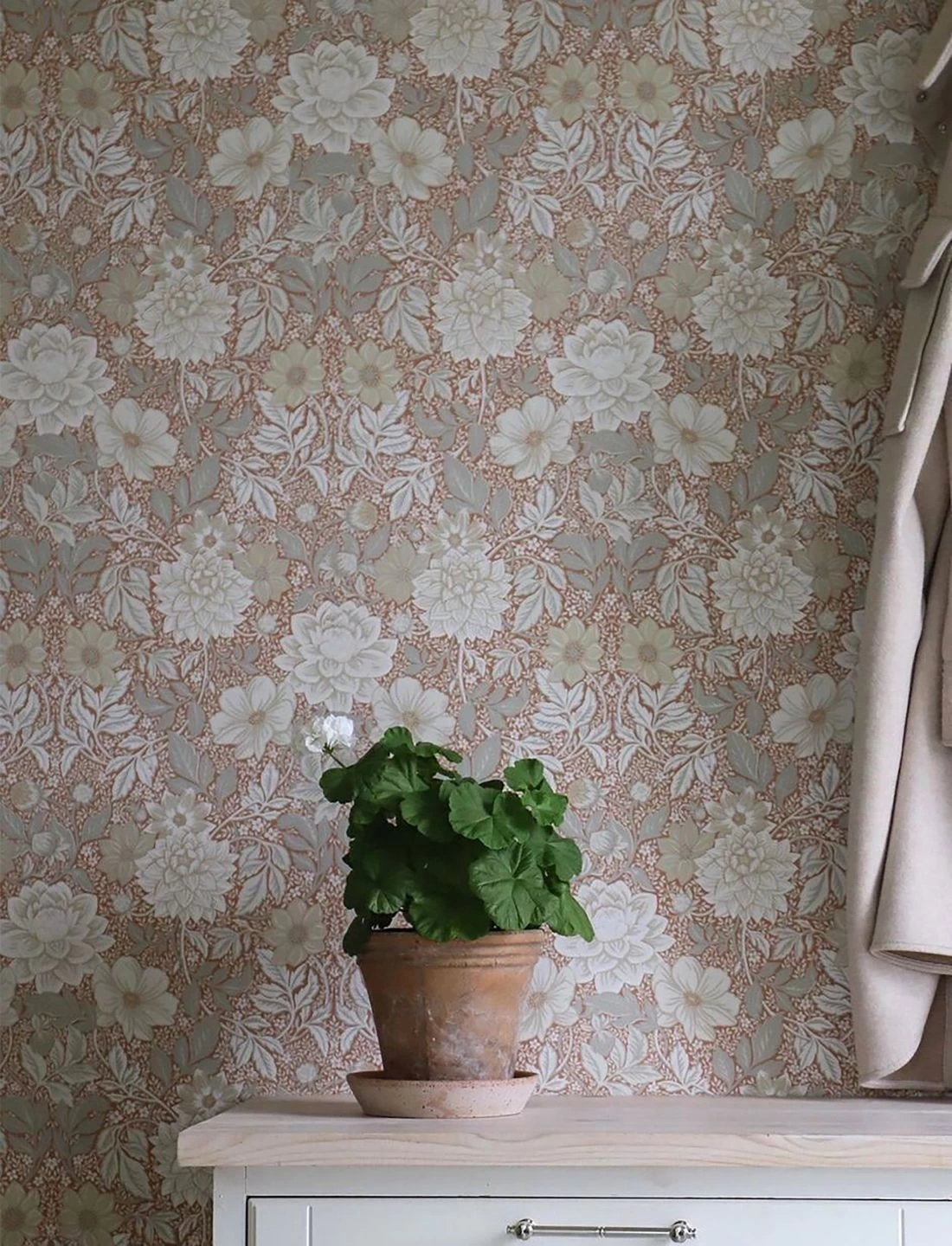 Eine Portion Nostalgie ist mit im Spiel bei der im Leimdruckverfahren hergestellten floralen Tapete Kerala. Denn die vielfältigen stilisierten Blumen und Blattranken, aber auch die Farbgebung erinnern an Designs aus der Epoche der Symbolisten und des Jugendstils. Der kupferbraune Untergrund gibt den zarten Hellgrau-, Hellgraubeige- und Weißtönen der kunstvoll arrangierten Blumenranken einen kräftigen Halt und einen farblich abgestimmten Rahmen.