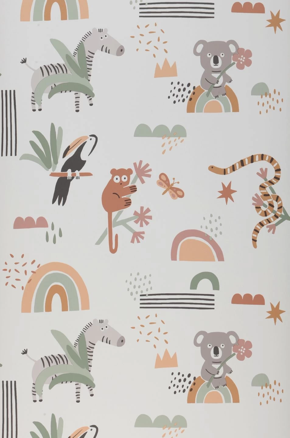 Wie die Abbildungen in einem fantasievollen Bilderbuch sehen die verschiedenen exotischen Tiere aus, die sich hier wie in einem großen Zoo an der Wand versammelt haben. Zebras, Koalabären, Schlangen, Tukane – hier gibt es vieles zu entdecken und zu beobachten. Helle, perfekt abgestimmte Farben machen die Papiertapete Kiki zu einer ebenso hübschen wie unterhaltsamen Bereicherung für das Kinderzimmer.