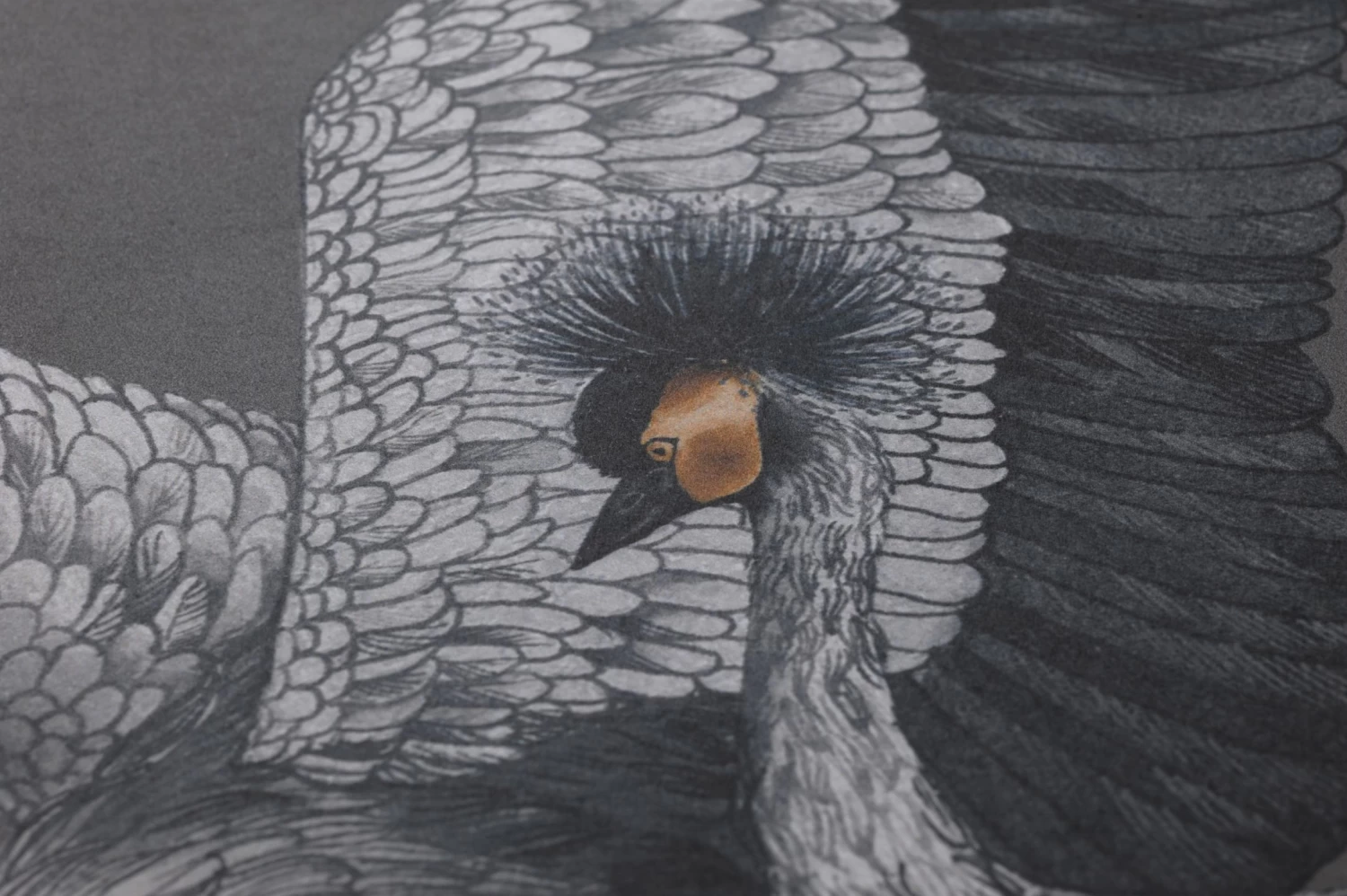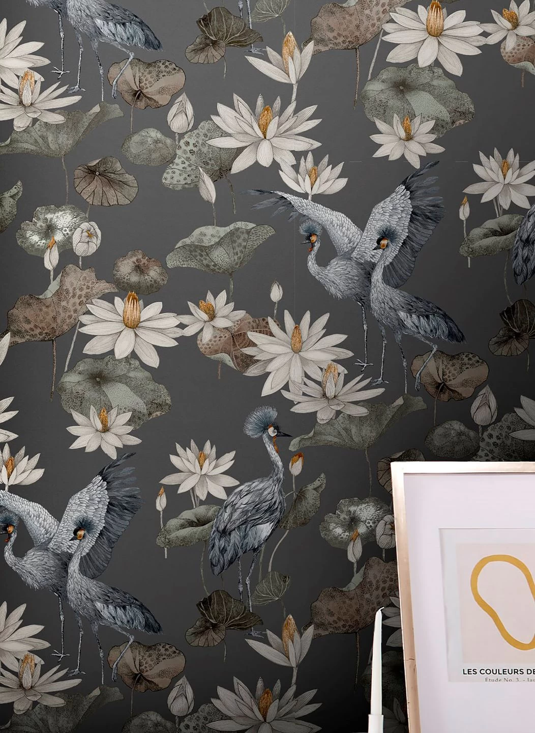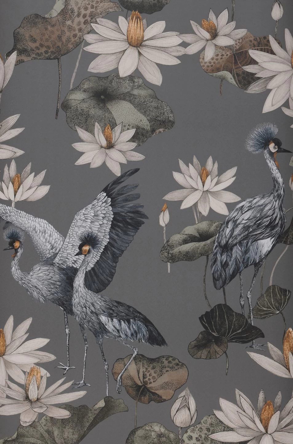 Besonders elegant vermittelt die orientalische Tapete Kimora die asiatische Ästhetik. Auf dem dunkelgrauen Grund sind mit liebevollen Details versehene Kronenkraniche abgebildet. Dazwischen Lotosblumen, teils voll erblüht, teils als heranwachsende Knospen. Ihre charakteristischen Blätter komplettieren das Design. Das Spiel mit den Größenverhältnissen setzt der realistischen Zeichnung der Kraniche und Lotosblumen eine Portion Abstraktheit entgegen und schafft ein reizvolles Spannungsfeld.