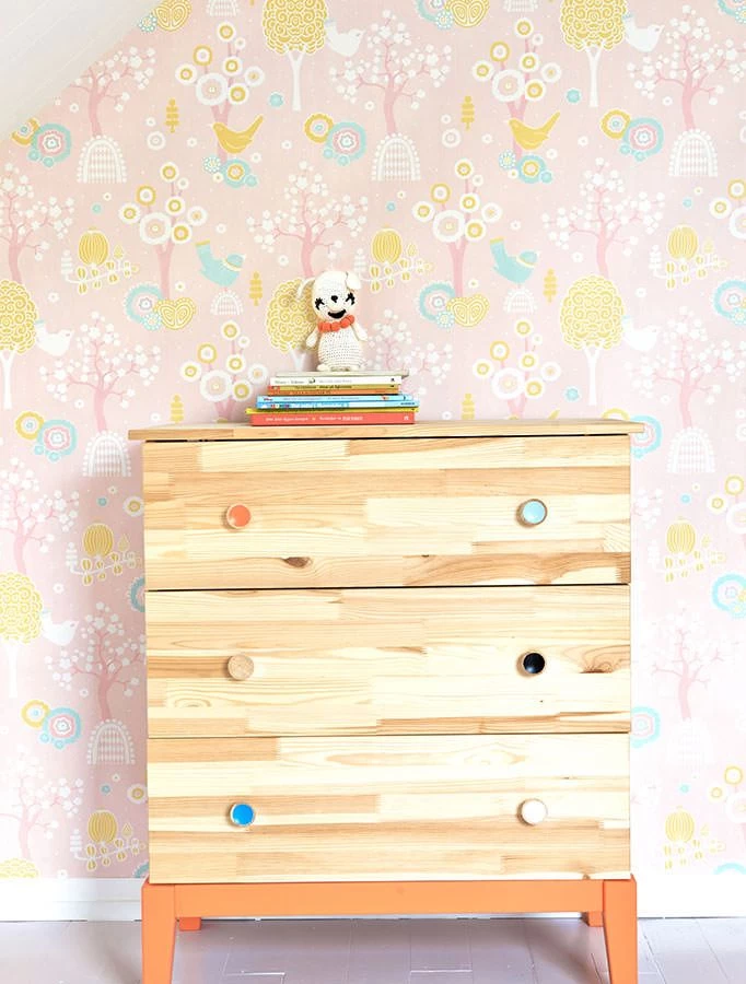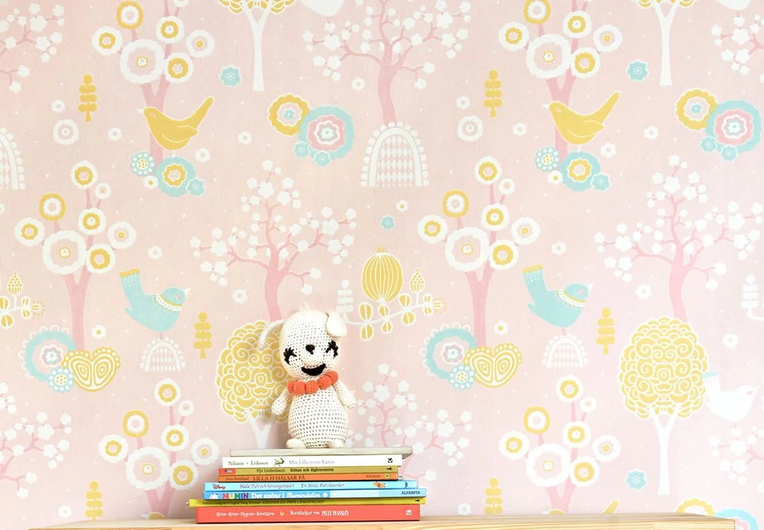 Die Welt darf pastellrosarot sein, dazwischen Blüten, Falter, Vögel und Bäume in Altrosa, Cremeweiss, Pastelltürkis, Sandgelb, die das Muster je nach Betrachtungswinkel geschickt wie ein zartes Graffiti wirken lassen. Die anregende Designer Tapete lässt sich wunderbar mit farbigen Möbeln in den Musterfarben oder aus weichem hellem Holz kombinieren.