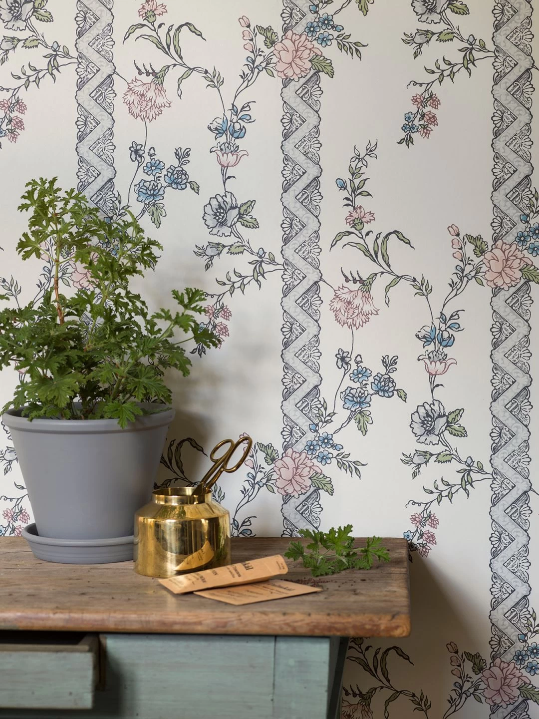Ein Hoch auf dieses klassisch angehauchte Tapetenmuster, das aus starren Regeln ausbricht. Die munteren Blumenkranken schlängeln sich ohne Rücksicht auf Symmetrie über die kunstvoll gestalteten Streifen hinweg. So, wie sich die Fantasie aus engen Grenzen befreit und den Gedanken ihren Lauf lässt.