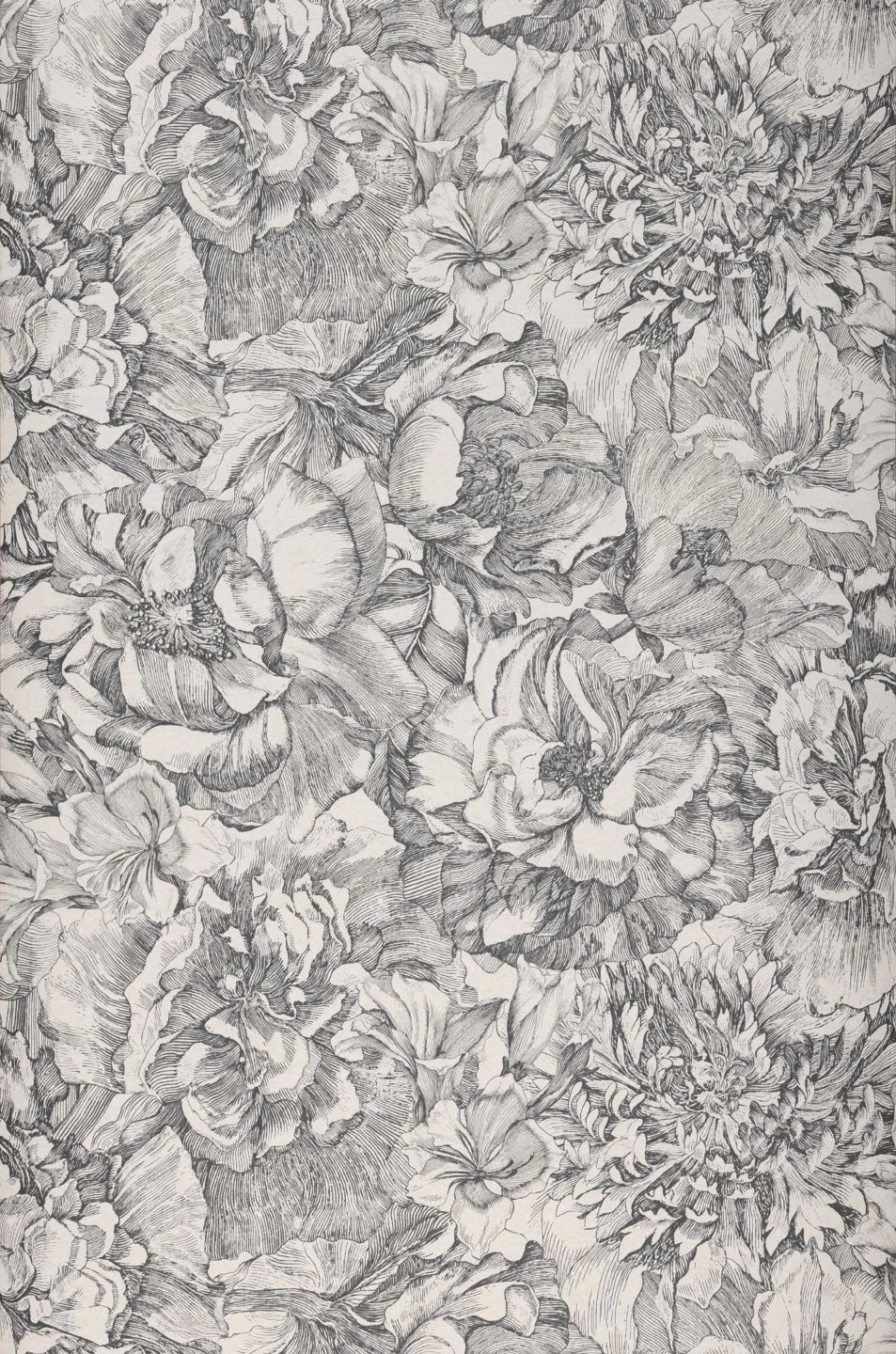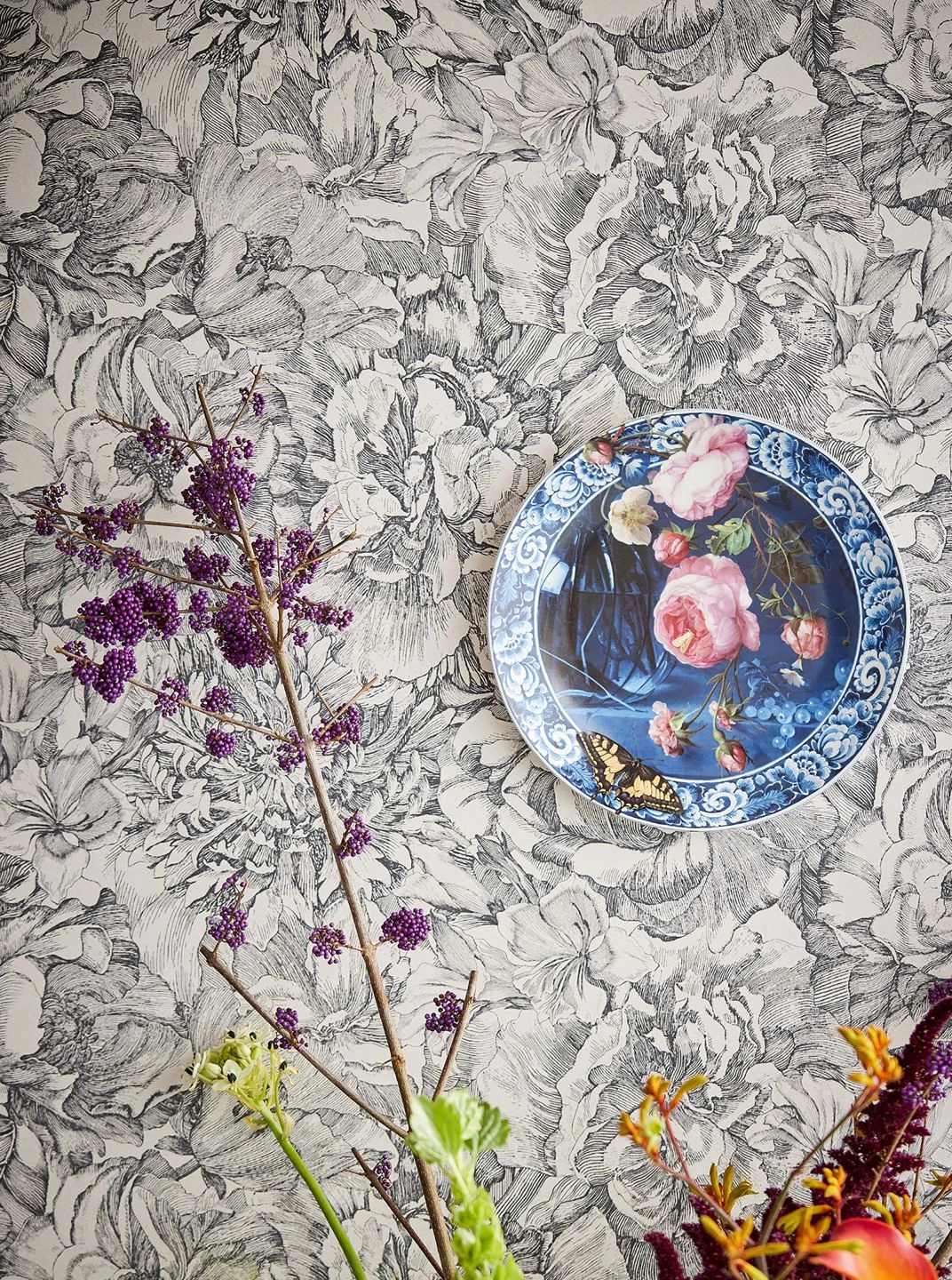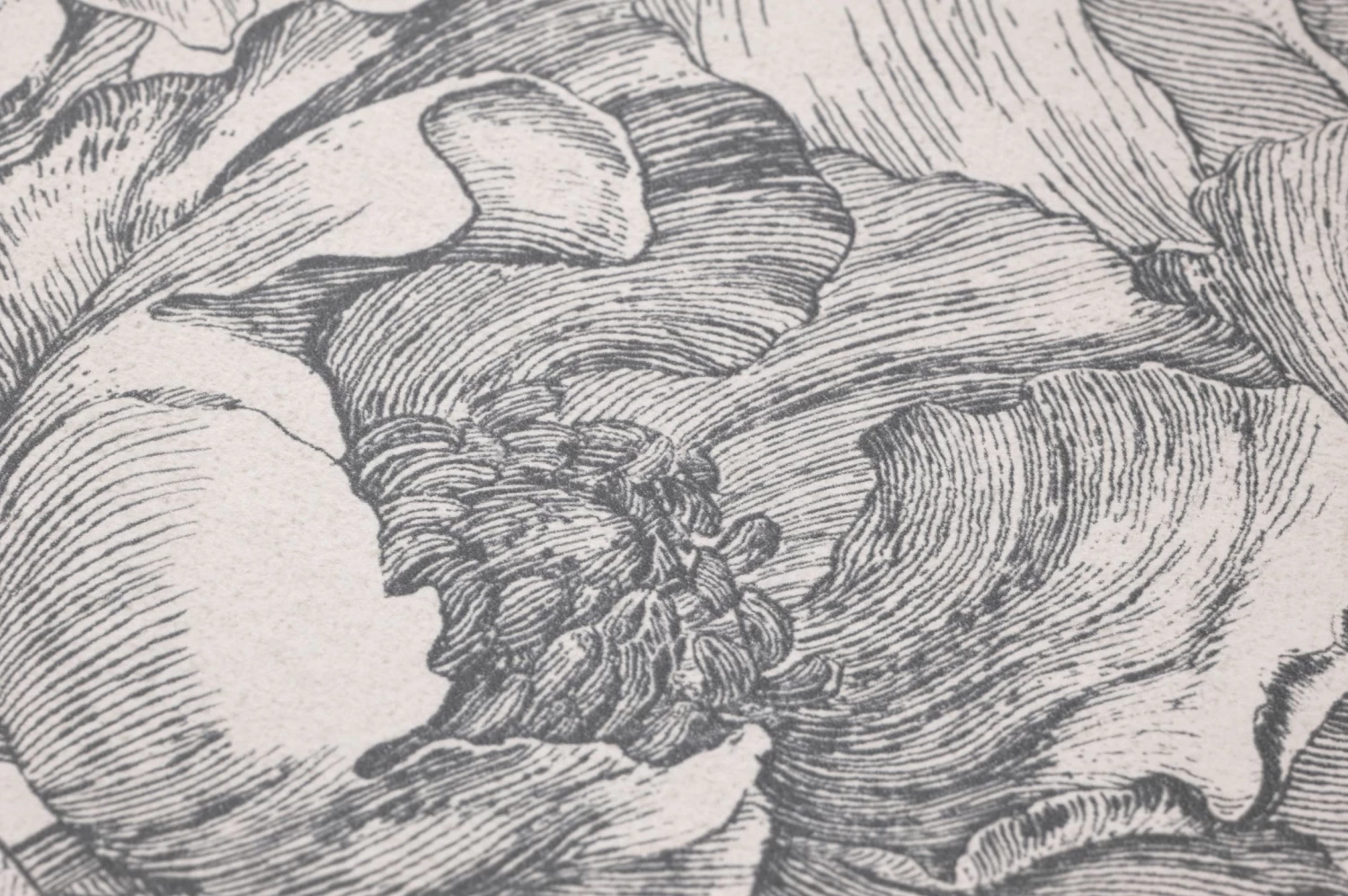 Ein faszinierendes Gesamtbild bilden die großen, ausladenden Blüten, die sich aus feinen Linien und Schraffuren in Basaltgrau zusammensetzen. So entsteht die Anmutung eines historischen Kupferstichs. Die phantastischen Formen, wie in Nahaufnahme dargestellt, geben Ihrem Raum einen bewegten Charakter, indem sie die glatte Wand aufzulösen scheinen. Louise lässt sich mit jeder gewünschten Farbe kombinieren, bietet aber auch einen wirkungsvollen Hintergrund für schwarze oder weiße Möbel.