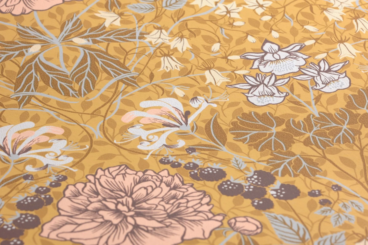 Unterschiedliche Farben verändern die Wirkung ein und desselben Musters. Die leicht exotische und Vintage anmutende Farbharmonie aus Sandgelb, Dunkelbraun, Olivbraun, Zartblau und Zartrosa zaubert eine wohlige Atmosphäre, die an Vertrautes, Großartiges erinnert. Gestalten Sie Räume, die intensiv wirken dürfen, mit dieser waschbeständigen Klassik Tapete.