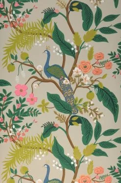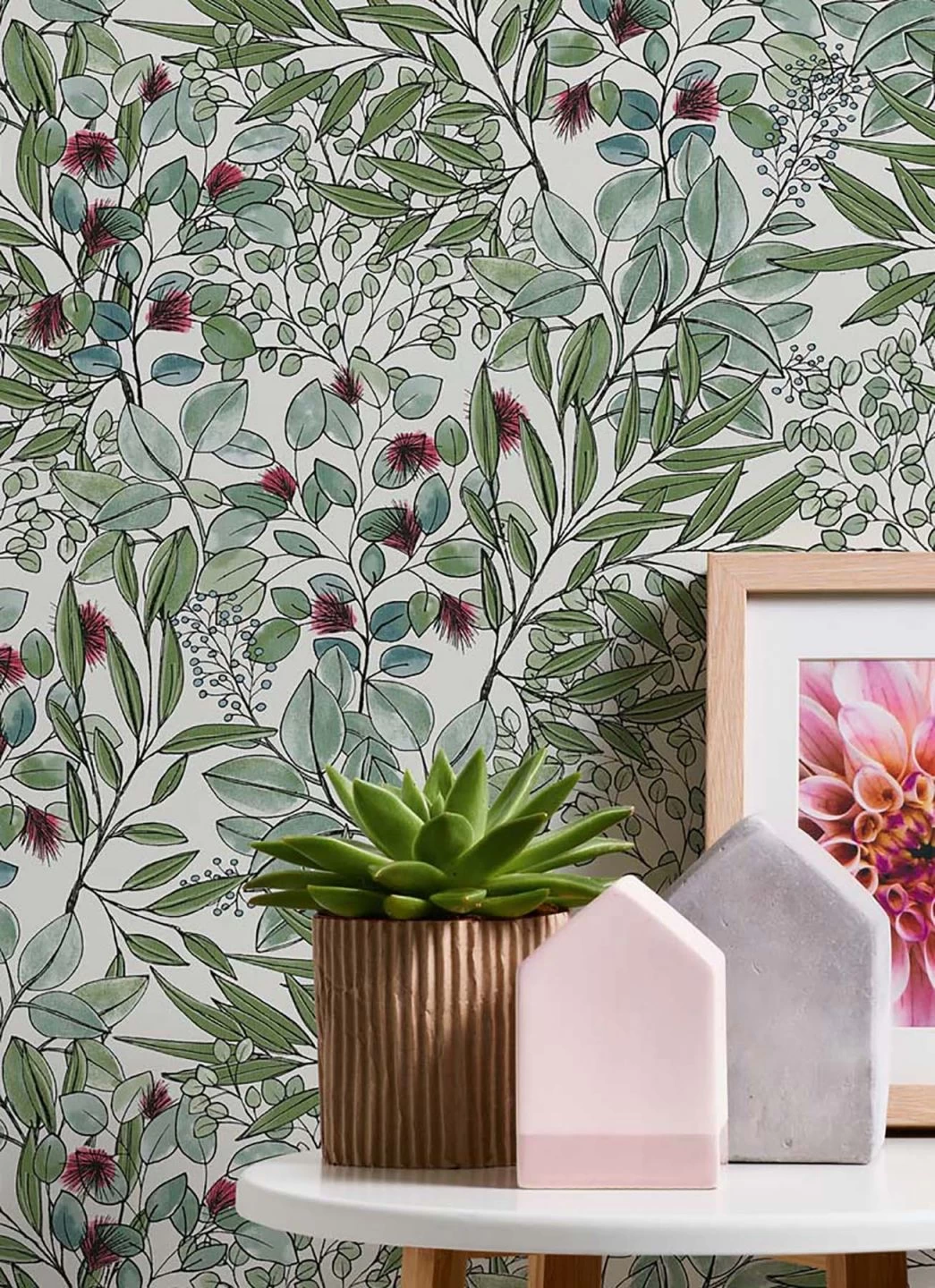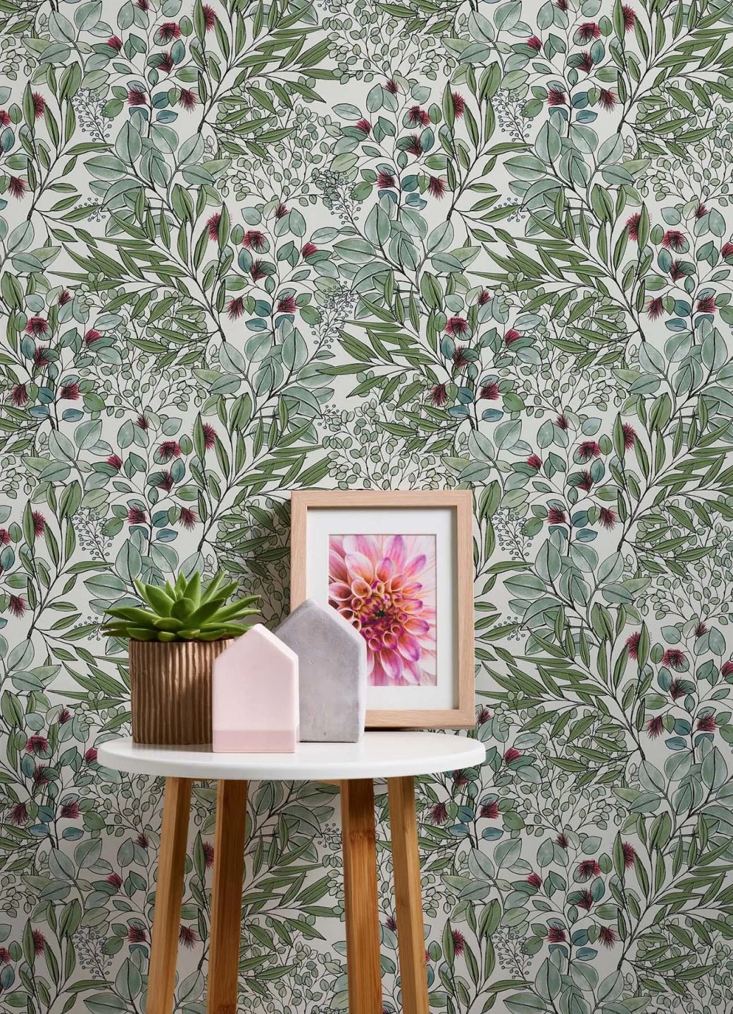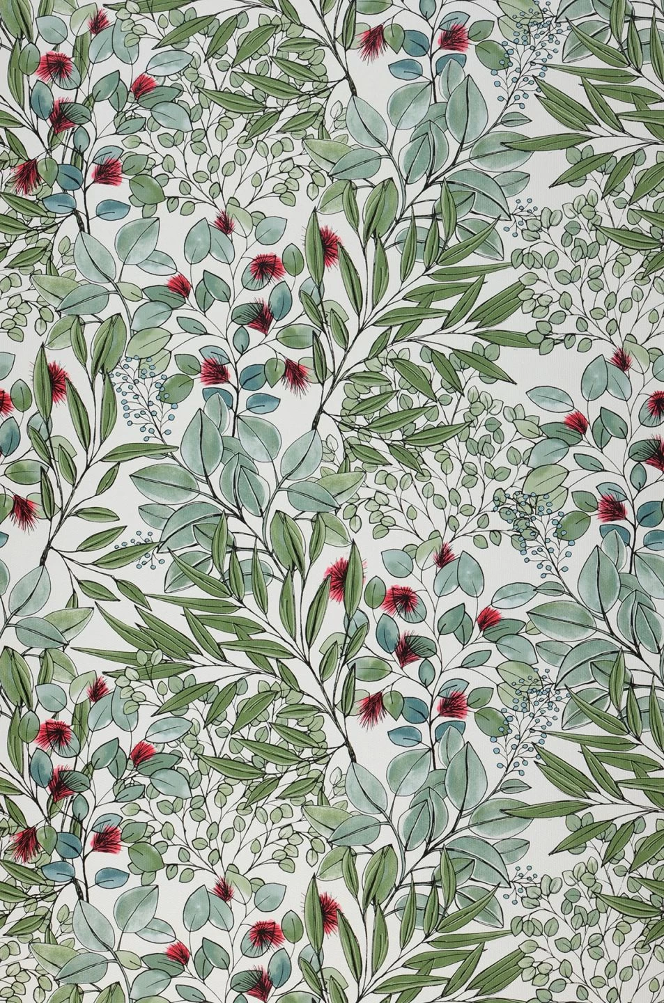 Die Blätter in verschiedenen Grüntönen wirken mit ihren schwarzen Umrisslinien wie im Comic-Stil gezeichnet. Rote büschelartige Blüten leuchten aus dem Dschungel der Blätter hervor und erinnern an die exotischen Formen tropischer Pflanzen. Das Vinyl der Oberfläche hat eine textilähnliche Struktur wie ein gewebter Stoff und erlaubt es, die Tapete sogar im Badezimmer einzusetzen. Ebenso kann sie problemlos feucht gereinigt werden.