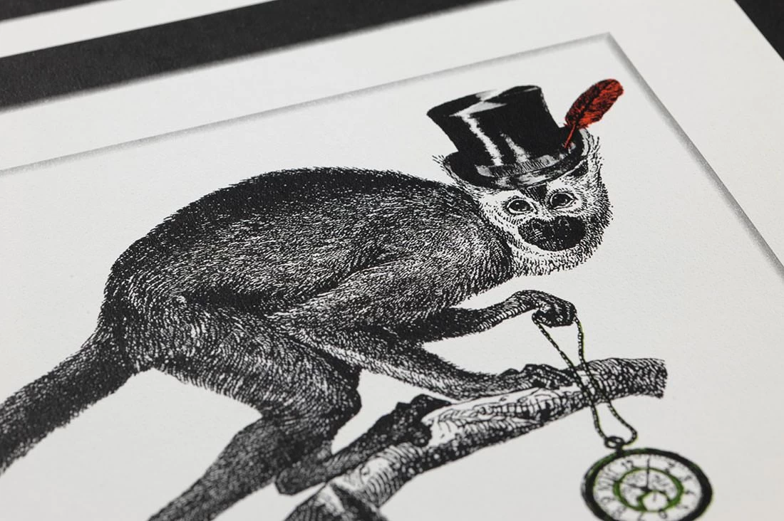 Wie ein Sammelsurium von schwarz gerahmten Kupferstichen bebildert „Maleme“ Ihre Wand mit Abbildungen von Tieren mit ungewöhnlichen Accessoires. Von einem Flamingo mit Aktenkoffer und Melone über eine Giraffe mit Tabakpfeife bis zu einem boxenden Känguru sind witzige Kuriositäten zu entdecken. Details in leicht schimmernden Farben unterbrechen die schwarzweiße Anmutung der extravaganten Papiertapete und ziehen den Blick auf sich.