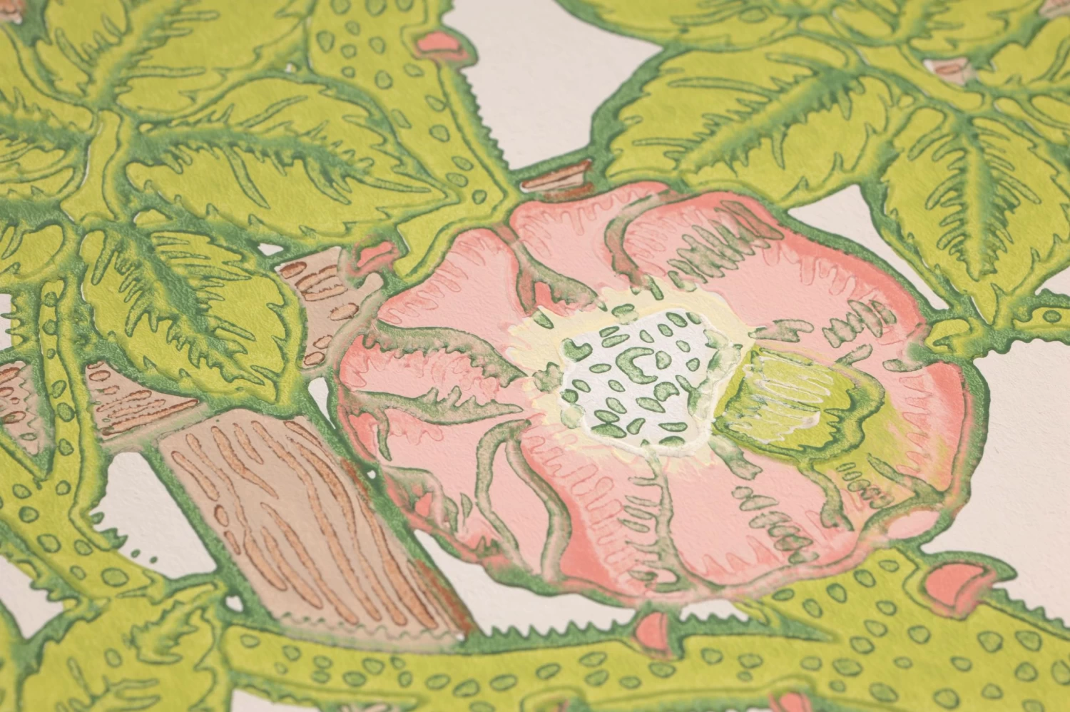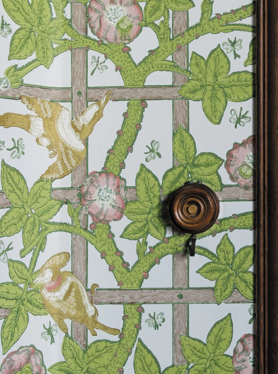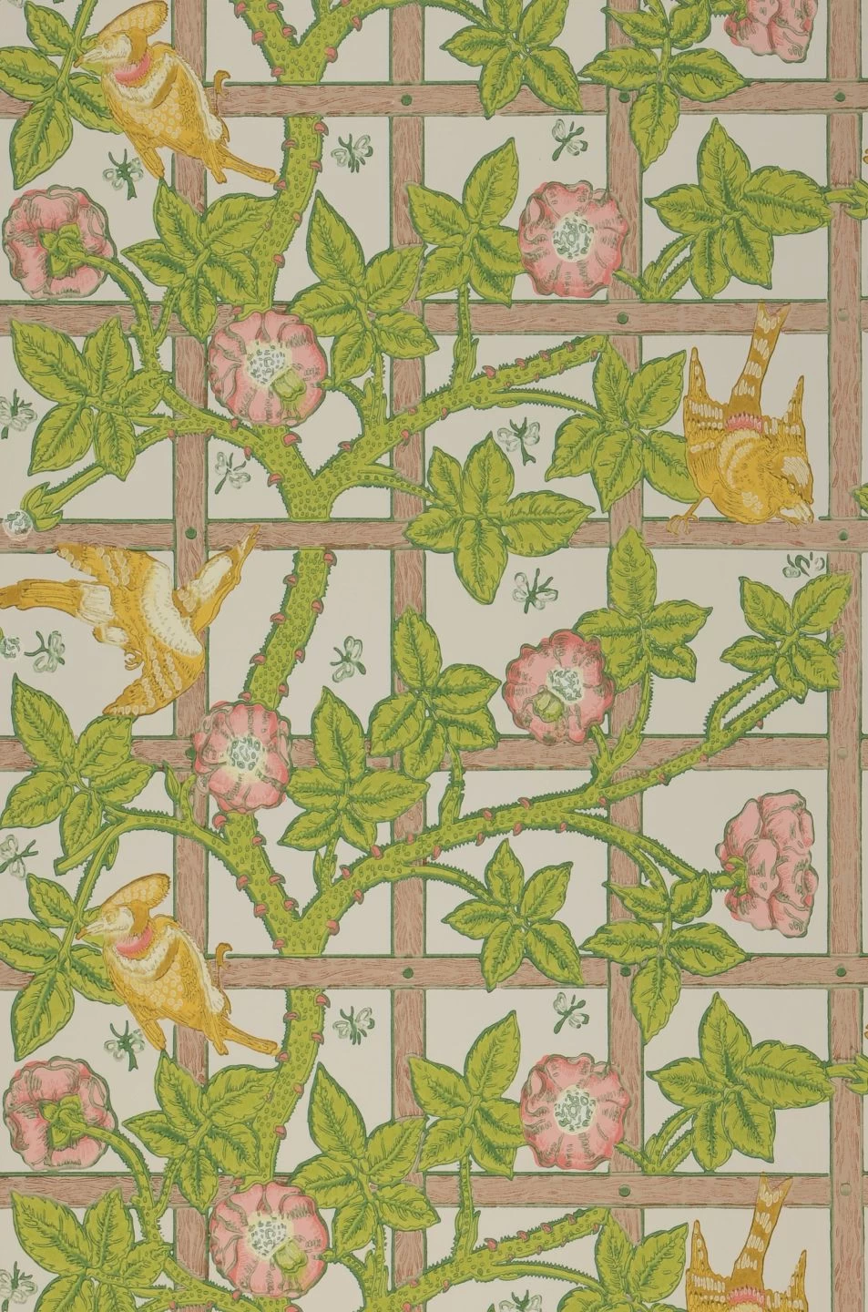 Mit Papiertapete Matilda hat Morris & Co. ein historisches Tapetenmuster des Architekten und Designers Philipp Webb zu neuem, strahlendem Leben erweckt. Stilisierte Heckenrosen ranken sich um ein hölzernes Spalier, auf ihren dornigen Zweigen sitzen Vögel in warmen Gelbtönen, dazwischen vervollständigen Insekten den Eindruck eines Sommertages. Heller als das Originaldesign, gibt Matilda antiken Möbeln in dunklen Holztönen oder Weiß ein zauberhaft sonniges Ambiente.