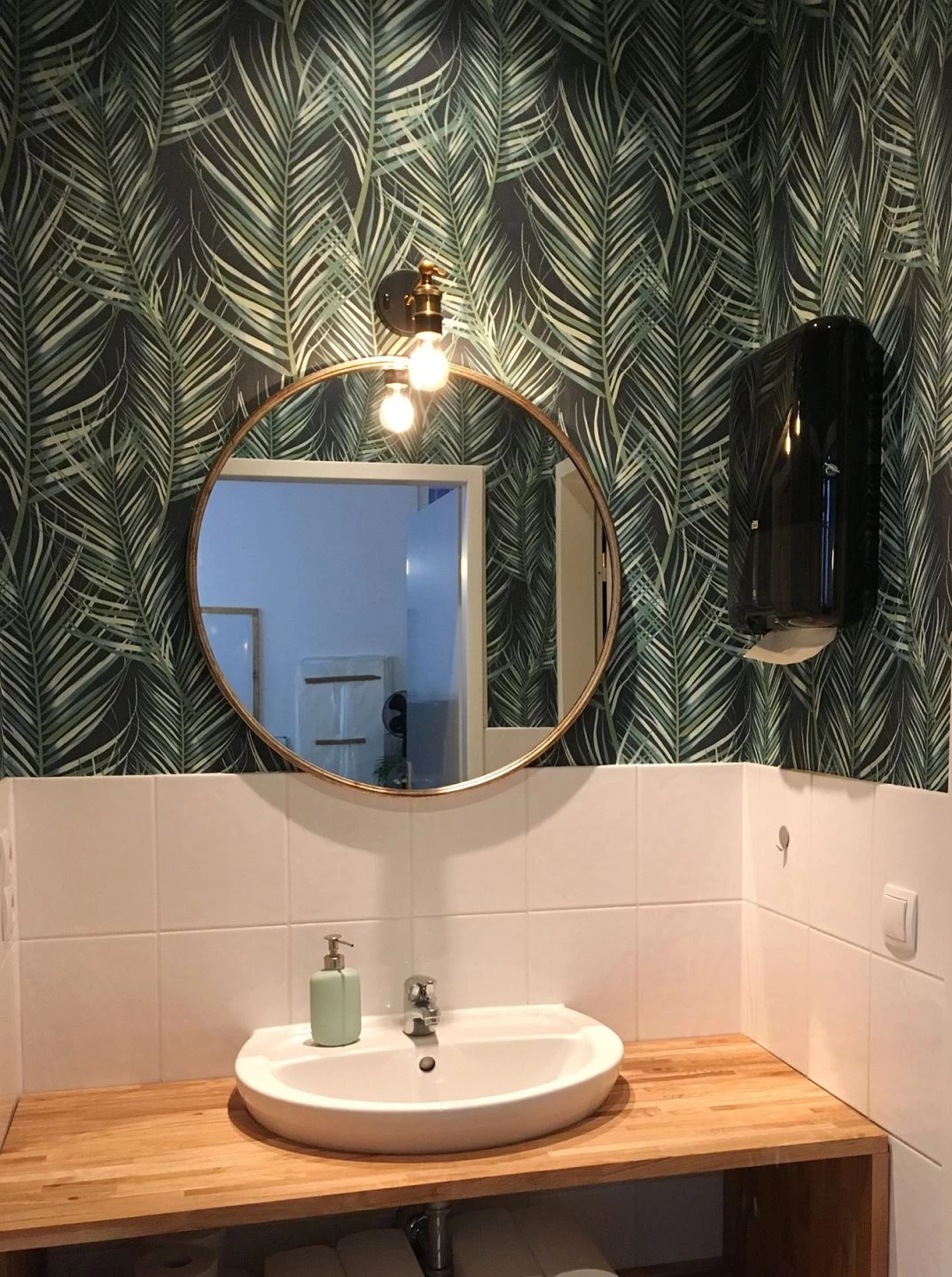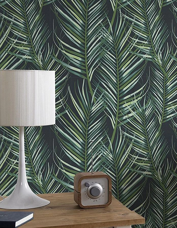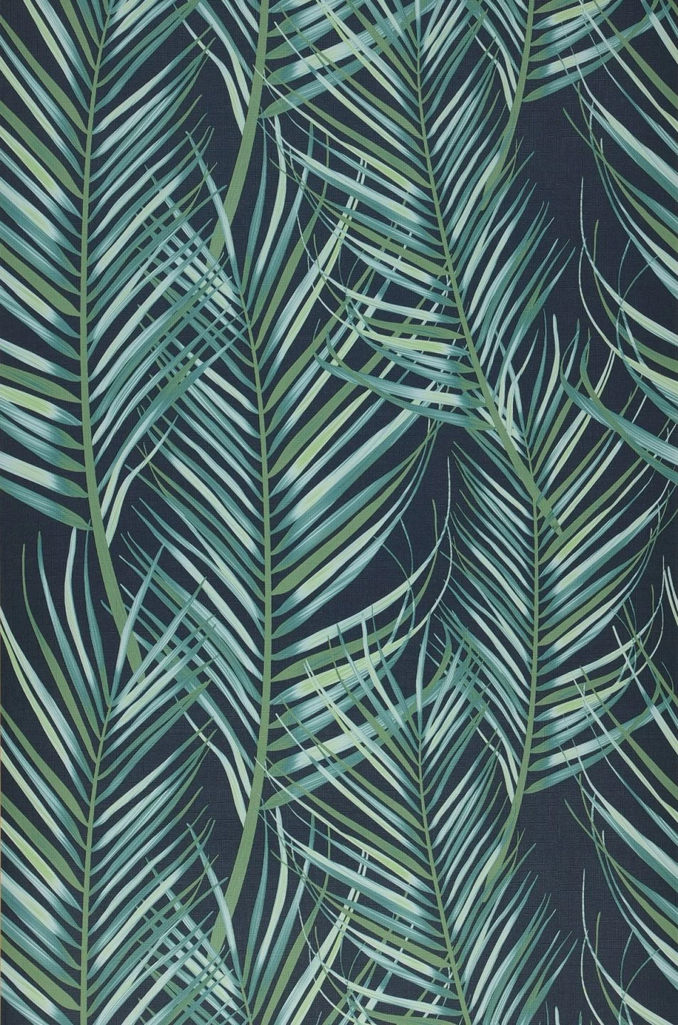 Das dichte Zusammenspiel der Palmzweige auf dem dunklen Grund hat etwas Beschützendes und Geheimnisvolles an sich. Durch die Blätter weht ein leiser Wind. Die beruhigende Wirkung der floralen Mustertapete schenkt Kraft und fördert den Scharfsinn. Auch in Baderäumen macht sich die waschbeständige Vliestapete wunderbar.