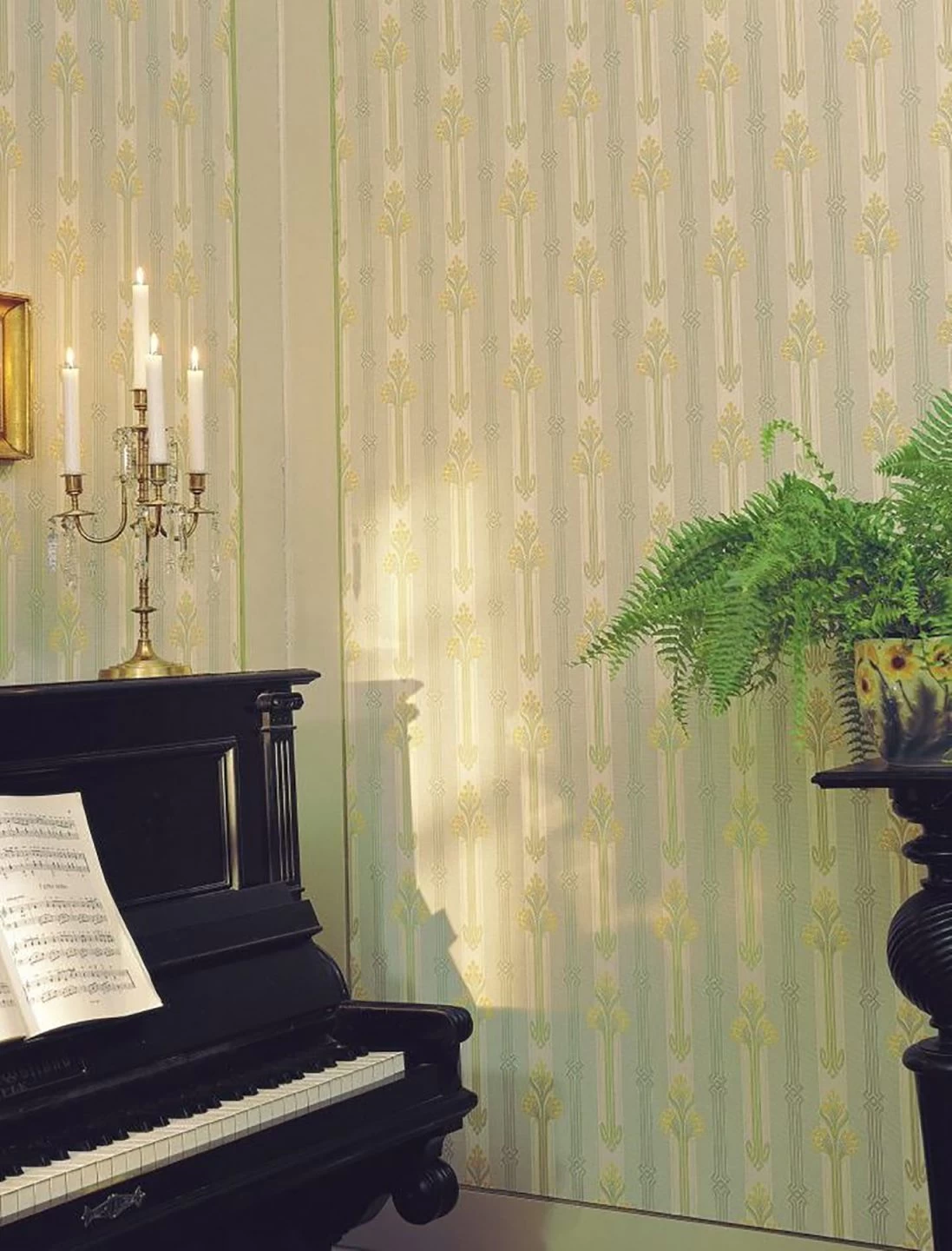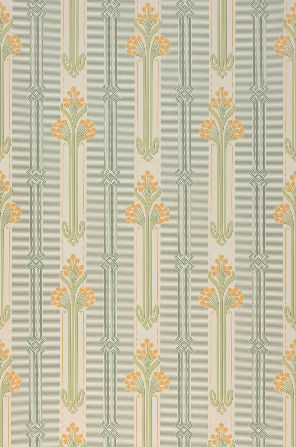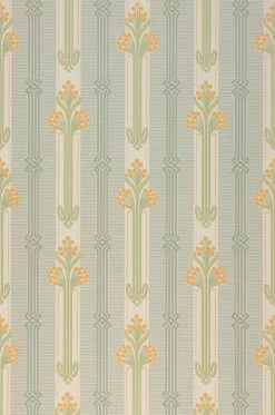 Safrangelb mit Grünnuancen auf cremeweißem Fond bringt das florale Jugendstilmuster in ein strahlendes Konzept. Die klassische Mustertapete steht Vintage-Einrichtungskonzepten sehr gut zu Gesicht, insbesondere, wenn antike Stilmöbel aus dunklem Echtholz mit von der Partie sind.