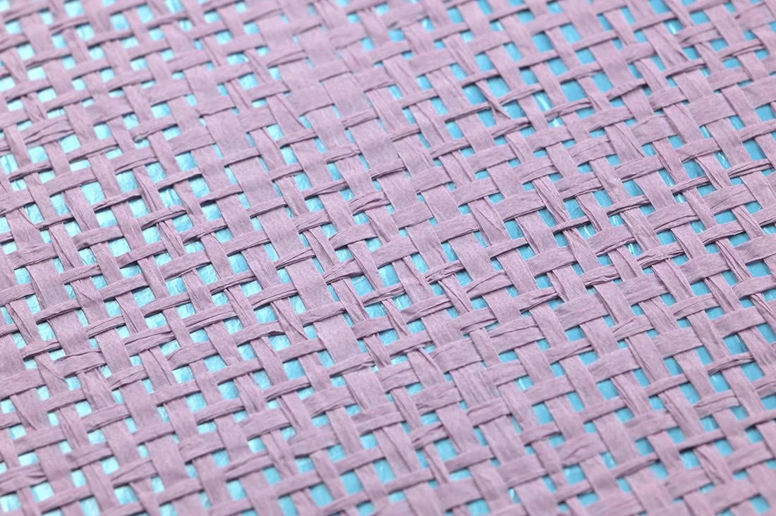 Ein grobmaschiges Gewebe aus hellvioletten Papierstreifen auf einem leicht schimmernden, türkisblauen Grund gibt dieser Tapete ihren ausgeprägten Charakter. Die zarten Farben verleihen Ihrem Raum eine sanfte Ästhetik, die Sie mit Möbeln in den verwendeten Farbtönen oder in Weiß noch unterstreichen. Der Kontrast zwischen Geflecht und Trägermaterial betont die Gewebestruktur und steuert einen Eindruck von räumlicher Tiefe bei.