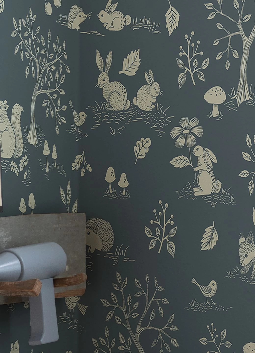 Eine Tapete voller kindlicher Freude an der Natur! Ein Häschen hält eine Blume in der Pfote, ein junger Fuchs hüpft ausgelassen über den Waldboden, ein Singvogel blickt unternehmungslustig in die Welt. Dazwischen Kaninchen, Igel, Bäume, Blätter, Früchte und Pilze. Die verspielten Zeichnungen bekommen Zusammenhalt durch den hellblaugrauen Grund und die grauweiße Musterfarbe. So wirkt die Vliestapete Nils zugleich belebt und ruhig.