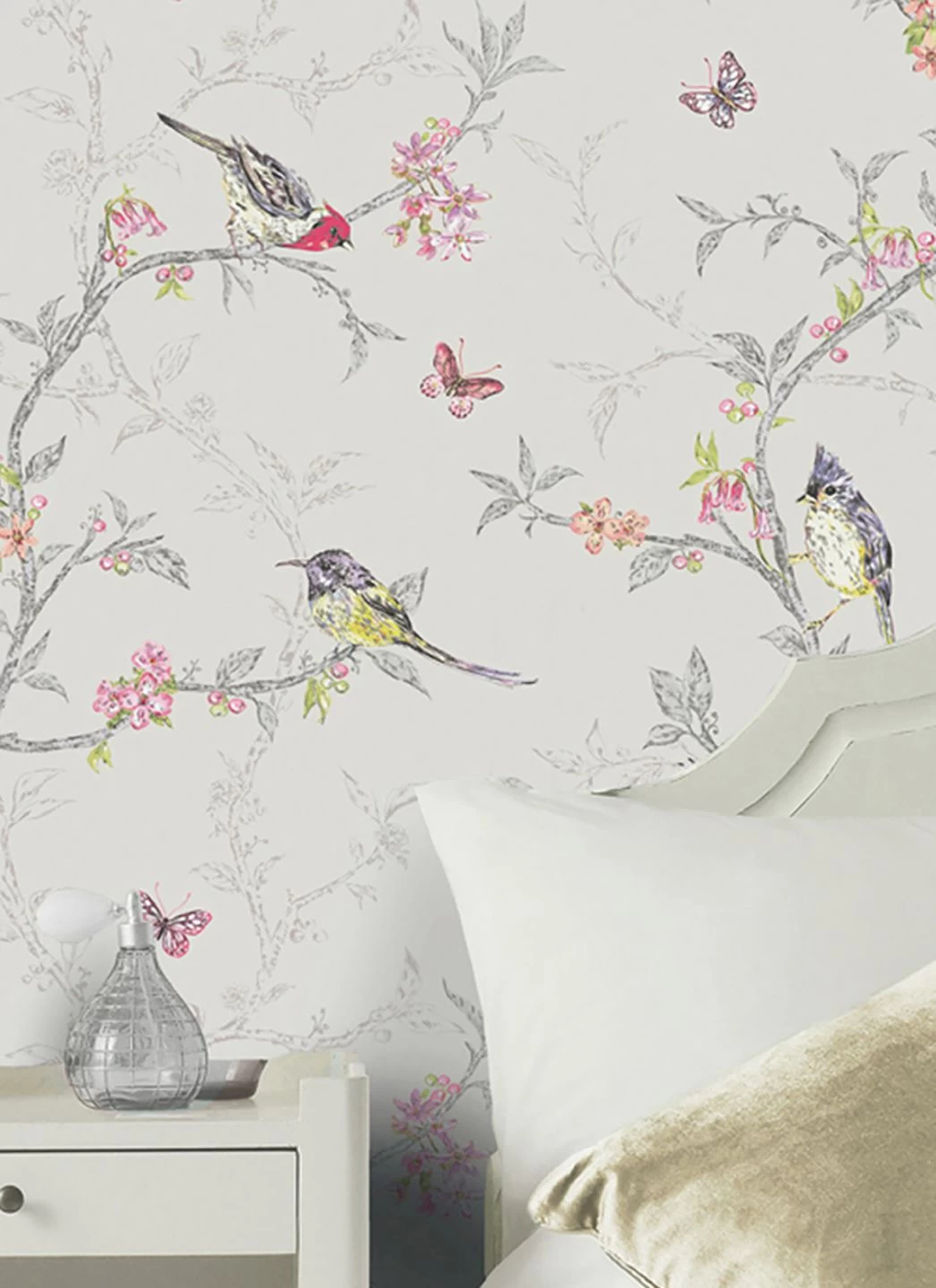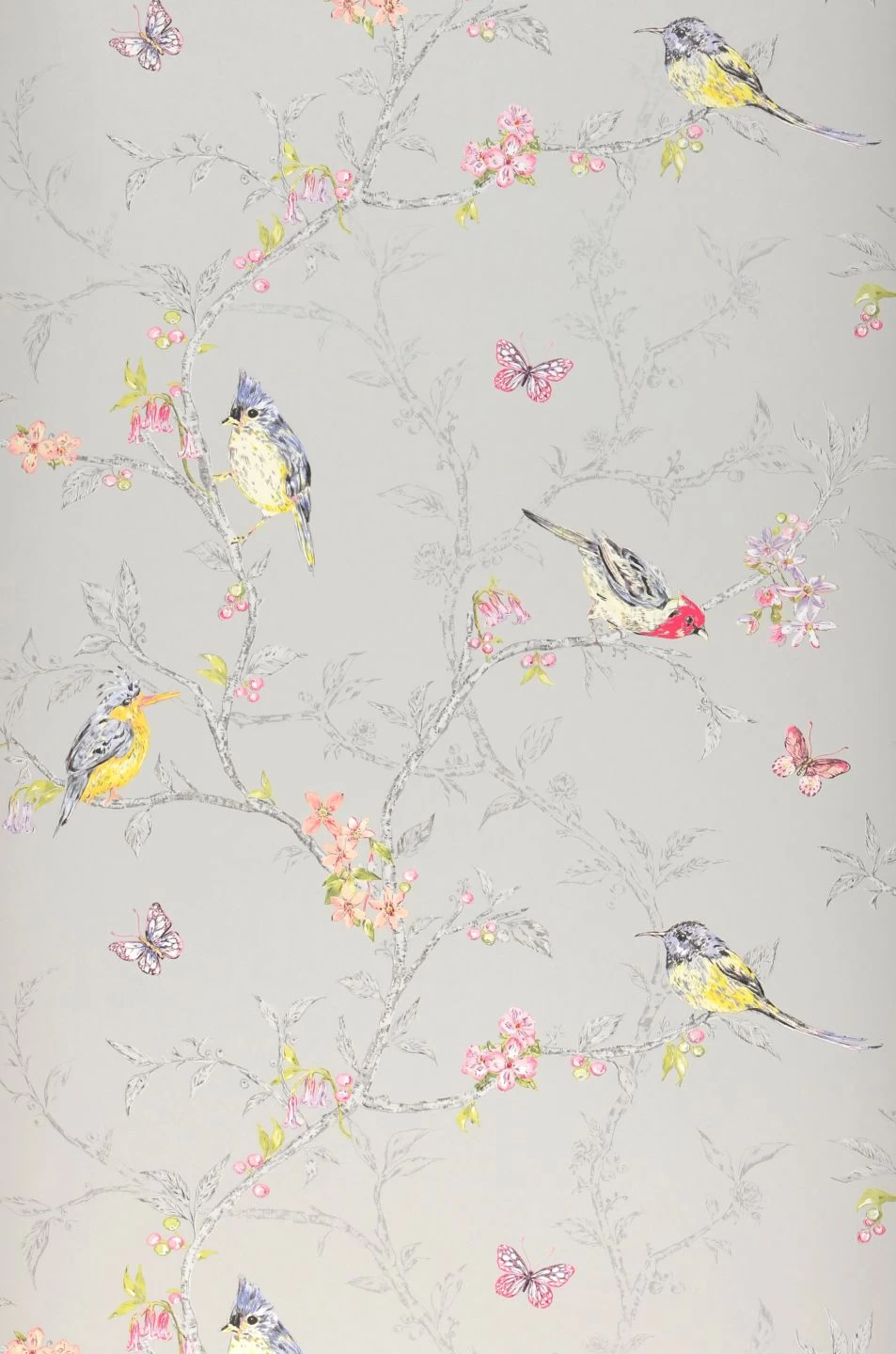 Die geschickte Farbgebung der Tiermotiv-Tapete Onni lenkt den Blick auf die farbenfrohen, zierlichen Vögel, die Schmetterlinge und Blüten in Rosatönen. Denn die Zweige, auf denen die Vögel sich tummeln, sind in verschiedenen Grautönen dargestellt. So entsteht der Eindruck räumlicher Tiefe, während das bunte Leben im Vordergrund verortet ist. Besonders schön wiedergegeben ist die flauschige Struktur des Gefieders der Singvögel, die man fast zu hören meint.